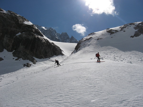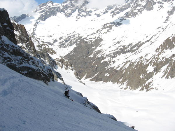 Au départ on voulait faire une journée tranquille en transfo pour se reposer, puis finalement l'orage de la veille nous pousse à viser la poudre en N. Direction le vallon de la condamine pour aller voir H5 (sans illusions) avec repli sur H6 si pas rempli. Finalement le repli se fera sur ce beau couloir que nous avions déjà skié avec LN en grosse poudre mais sous les nuages. Cette fois ci c'est en grains fins extras et avec le soleil! Lionel, parti psychologiquement pour un 4.3 se retouve dans un 5.3: ca y est le pas est franchi et d'une bien belle manière. A noter : le glacier au pied du couloir a pris une bonne claque en 3 ans: son espérance de vie se compte en années sur les doigts d'une main...