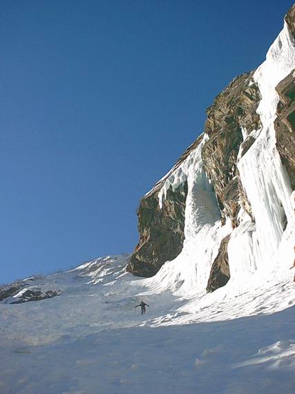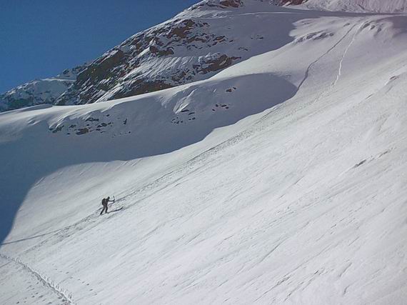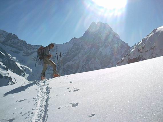 Dommage que la fin ne soit pas skiable, sans doute encore les méfaits de la déglaciation. Ca reste un bel objectif avec 1400m de ski de 1er choix dans des pentes toujours soutenues, et avec à peine 3/4H de portage dans les conditions actuelles. La montée est un beau belvédère sur la grande muraille de l'Olan. Enfin coté fréquentation c'est plutôt peinard, on peut d'ailleurs se demander pourquoi