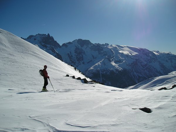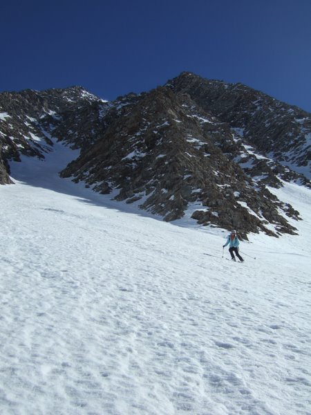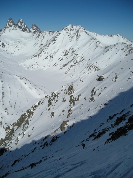 Montée (fastidieuse) depuis les Cours jusqu'à la crête de Côte Plaine puis on rejoint l'itinéraire classique des Trois Evéchés. Au bas du couloir, après le pique-nique (hélas sans sauc.), on avait envie de neige molle alors on est remonté au Cruq des Aiguilles au-dessus du tout nouveau et balèze refuge. Descente (trop) molle vue l'heure tardive + chaleur..