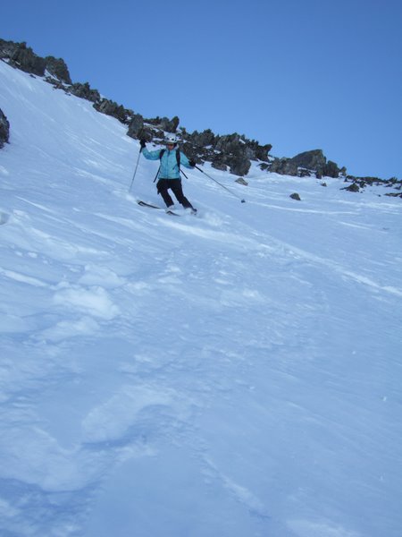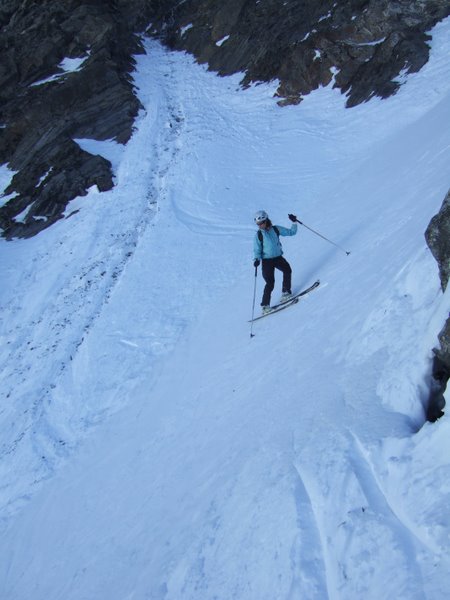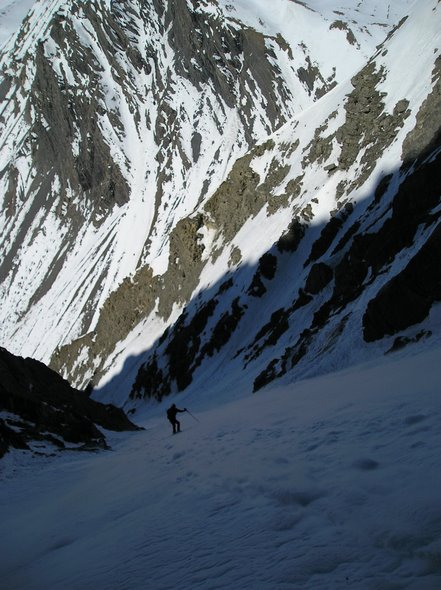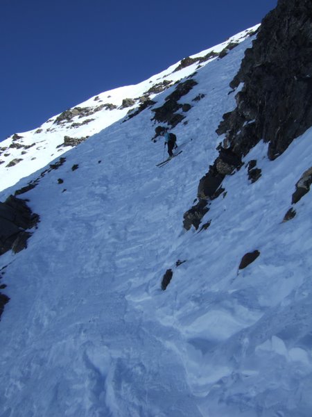 Mauvaise surprise dans le couloir : plus un pet de neige poudreuse mais un bon toboggan lisse. Heureusement le grip est bon mais il ne s'agit pas de s'endormir.. descente longue et tendue.