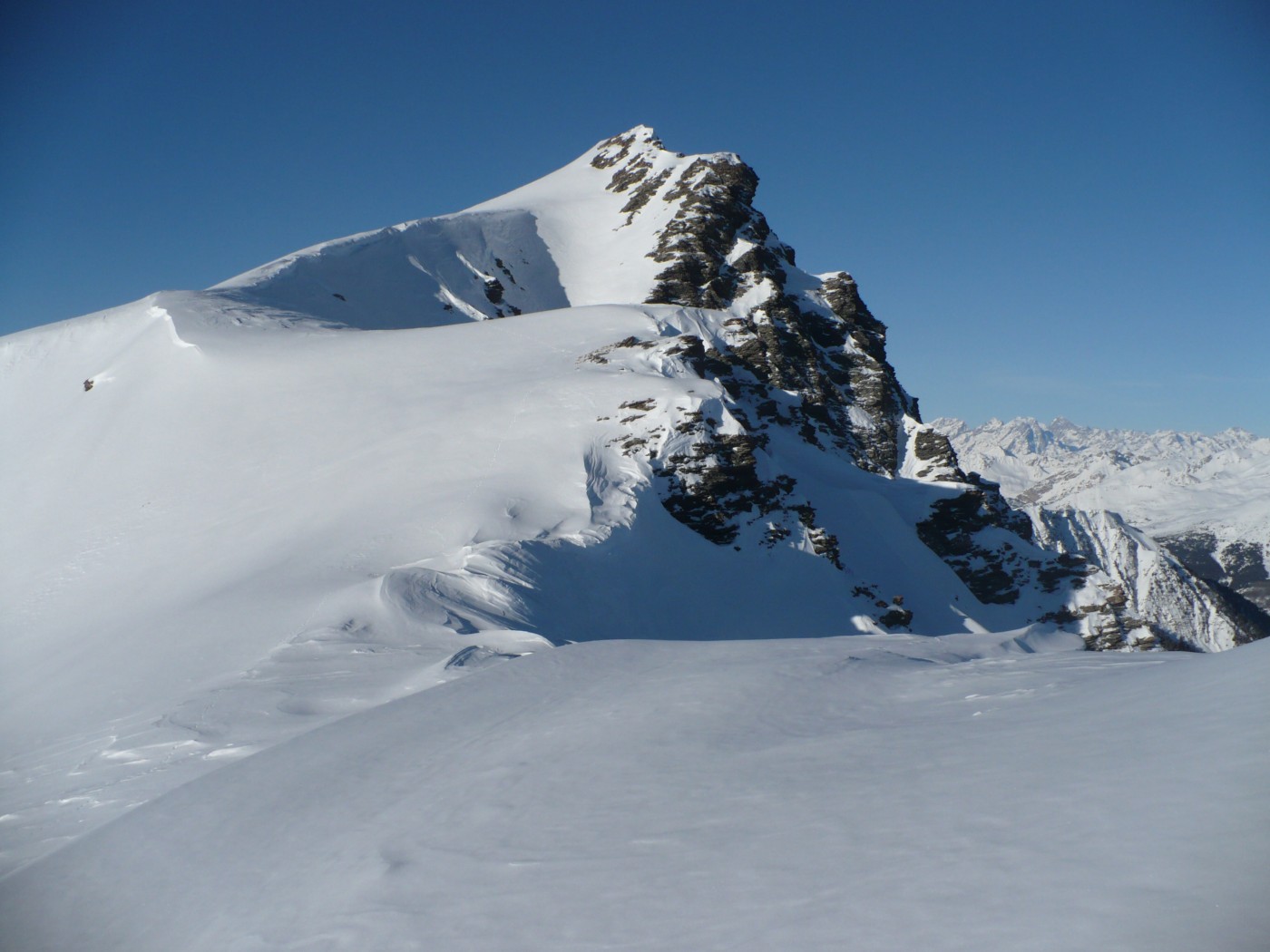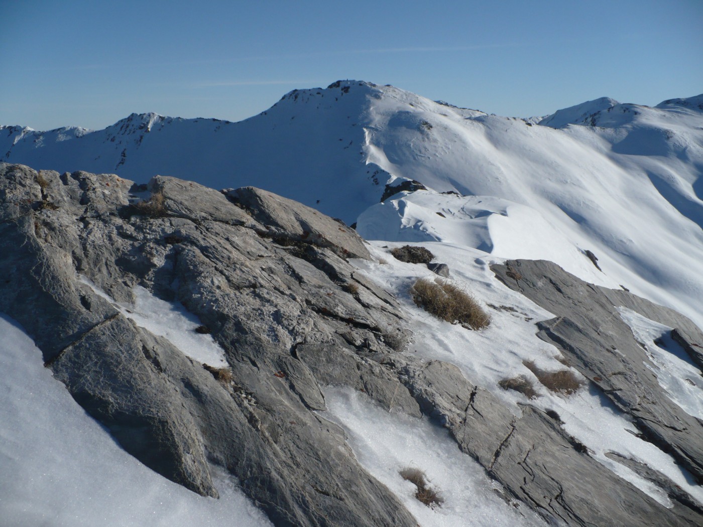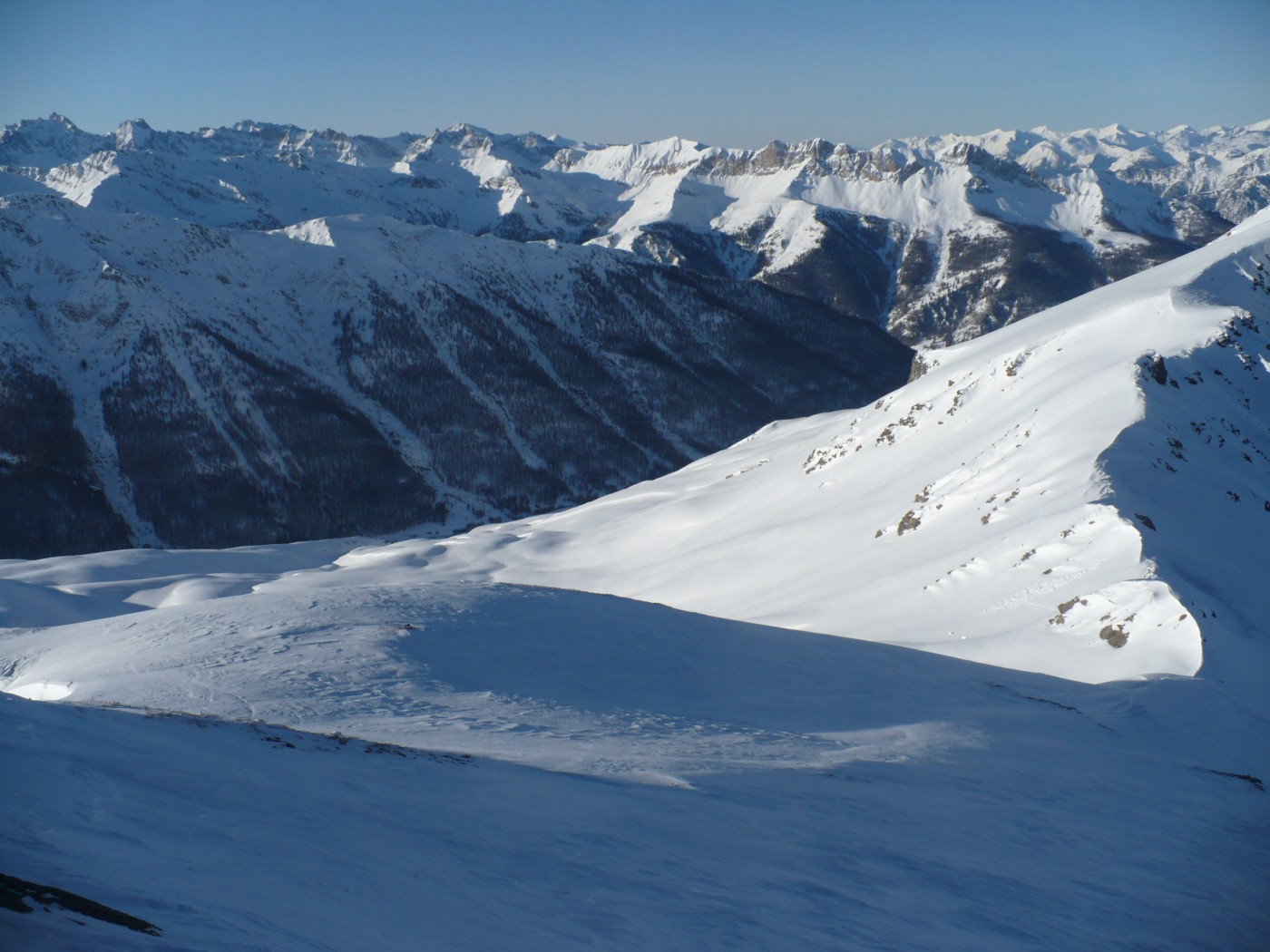 Globalement, la neige est restée froide ; poudreuse sur les bosses et dans les combes, puis durcie par le vent à l’approche du sommet sur la croupe S/O du Pic du Fond de Peynin ; ensuite, sur la ligne de crête, alternance de neige légèrement cartonnée dans les combes à l’ombre et durcie par le vent à l’approche des cols. Neige en cours de transformation en sud à la descente.