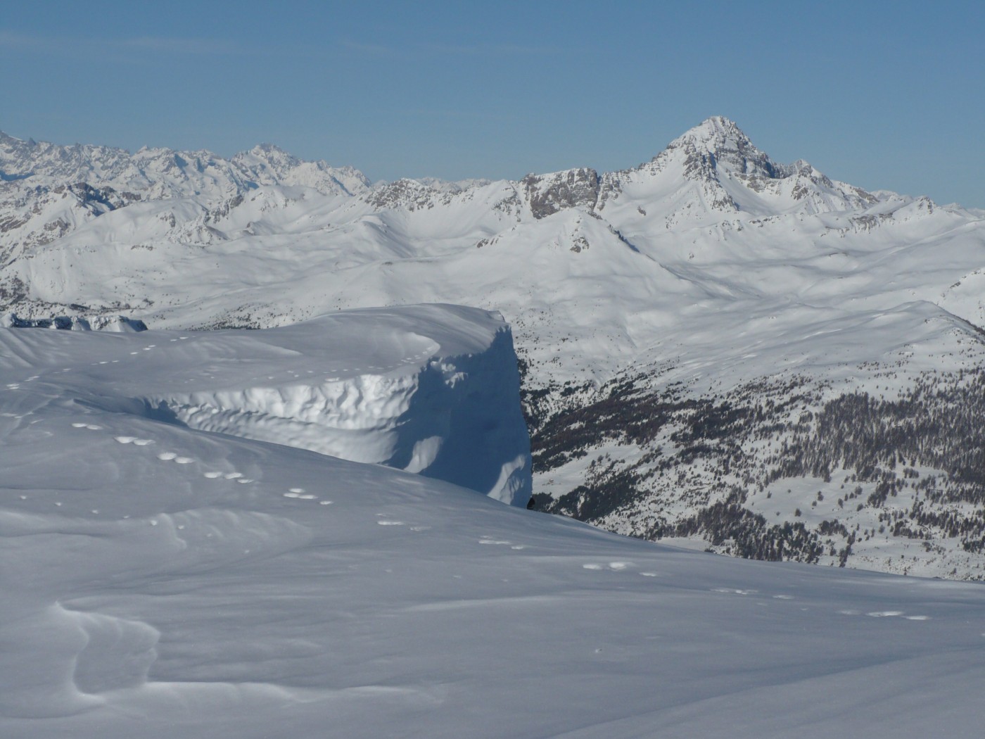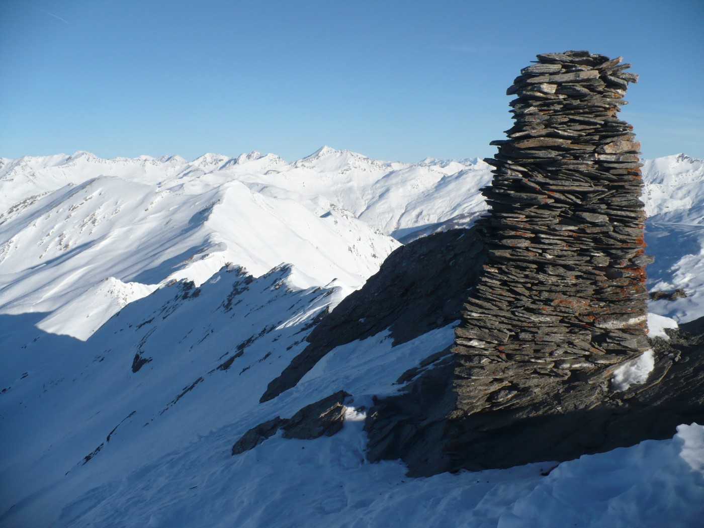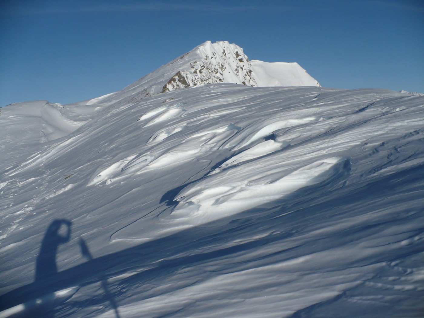 Globalement, la neige est restée froide ; poudreuse sur les bosses et dans les combes, puis durcie par le vent à l’approche du sommet sur la croupe S/O du Pic du Fond de Peynin ; ensuite, sur la ligne de crête, alternance de neige légèrement cartonnée dans les combes à l’ombre et durcie par le vent à l’approche des cols. Neige en cours de transformation en sud à la descente.