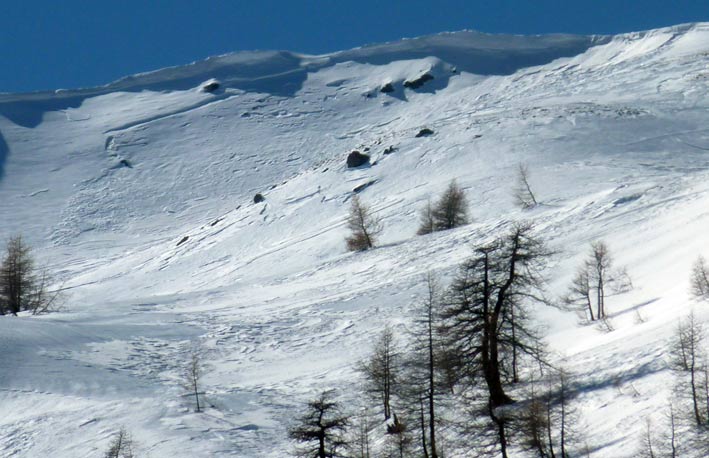 A noter une petite plaque déclenchée par des skieurs les jours précédent sous le vacivier, pour semble-t-il shunter le col de Furfande