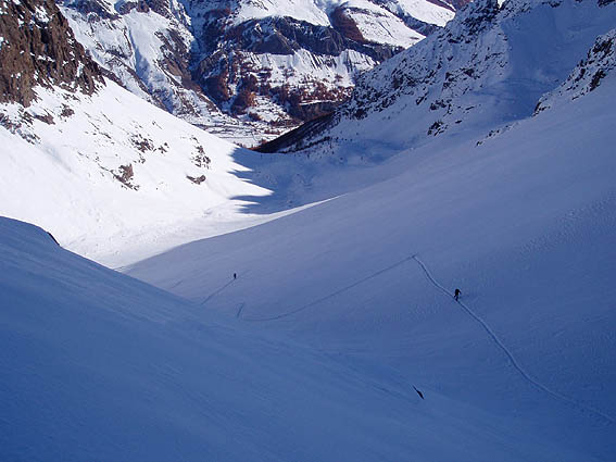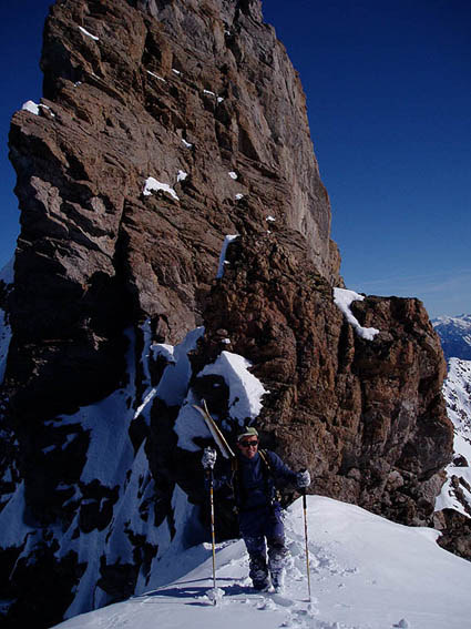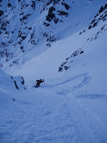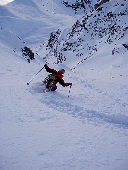 Une sortie comme on les aime : de la bonne neige dans les couloirs nord. Il fallait se remettre dans ce style d'ambiance après l'accident de Côte-Belle. La progression fut un peu plus prudente que par habitude mais ce n'est pas une mauvaise chose ; en plus cela ne nous a pas vraiment ralenti. C'est plutôt le gros paquet de poudre directement posée sur la roche dans le haut du couloir qui nous a vallu une bonne bavante pour sortir. Bonne pause au sommet au soleil, en tee-shirt et sans gants. Attention dans la descente du couloir à quelques cailloux sous-jacents à mémoriser à la montée. A noter les 30 derniers mètres où le dérapage est obligatoire pour ne pas toucher.