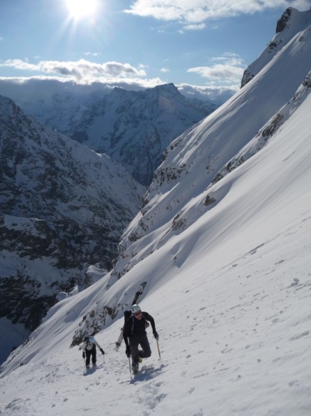 Direction la Tête Virante et à 2100 on tourne à gauche vers la face Nord du Pic du Mourre de la Mine. On a enchainé avec le couloir de droite.