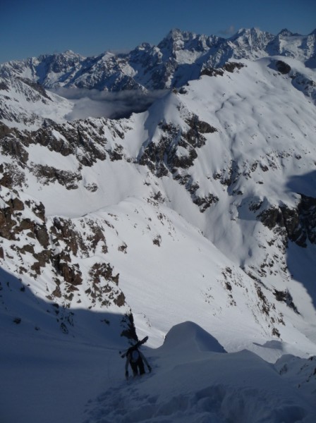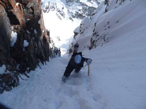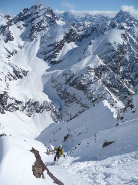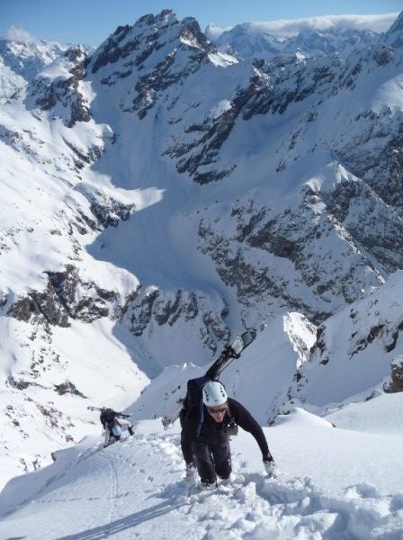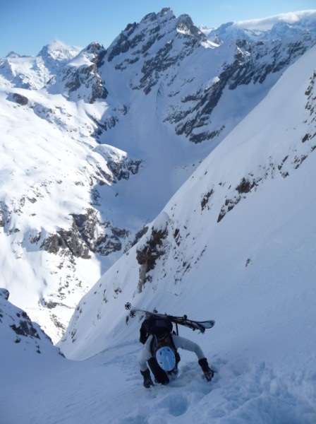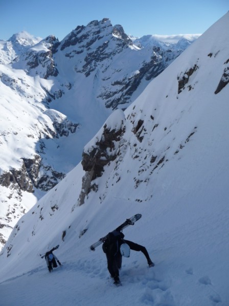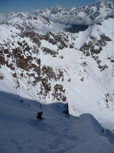 Réalisé cette année par Manu abelé & consors. En montant avec Olivier au Puy des Baumes on repère le cheminement et quand se sera remplis on ira y faire un tour. Beau au sud, chute de neige puis Iso encore bas, go. La première étroiture passe sans problème, la suite nickel, on se demande où est la pente ? puis vers 2450 ça s'énerve jusque 2850 où nous stoppons pour doute nivo ; de toute façon, c'est pas + raide et ça sort pas à la crête, la corniche est trop grosse. Bonne descente (5.2). Puis nous remontons le couloir de droite en A/R, raide et étroit (5.3, court 175m). Dans la descente vers 2100, au niveau de l'étroiture, nous sommes accueuillis par des grosses purges qui viennent du haut, neige chauffée par le soleil à travers un nuage. Nous hésitons pendant 45 min en attendant que ça se calme puis feu. Un très beau sommet et un cheminement astucieux...
