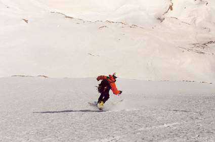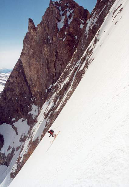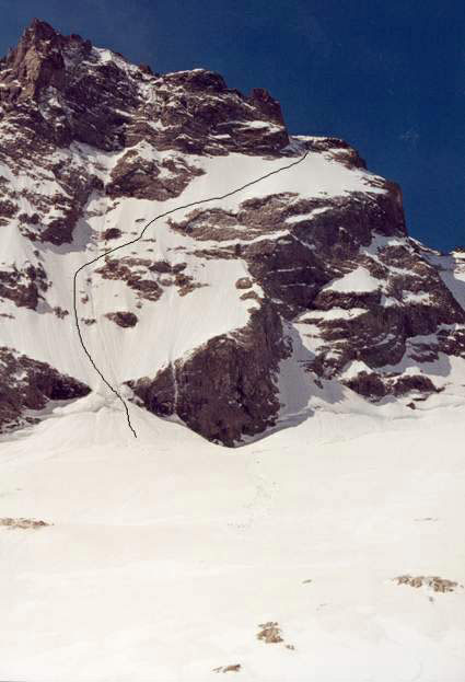 53°/500m d'après la carte. A mon avis rarement plus de 50. Je dirais 50°/350 jusqu' à la vire avec 2 passages un peu plus raides en traversée, puis 45° sur la vire jusqu'au petit couloir (non skié, s'enneigeant mal, apparement) 50°/50m. Coté exposition, ça vaut E4 pour le haut, mais même dans la partie qui semble rectiligne on est quasiment en permanence au dessus de barres. Grande ambiance. Neige peu adhérente sous les carres et absolument pas dégelée à 11h. A tenter de préférence par neige froide à cause des chutes de pierres dans le bas de la face