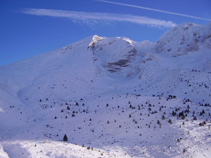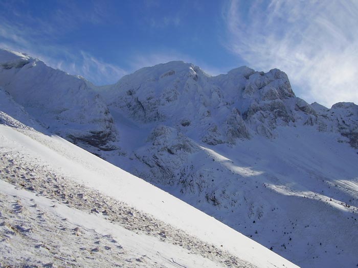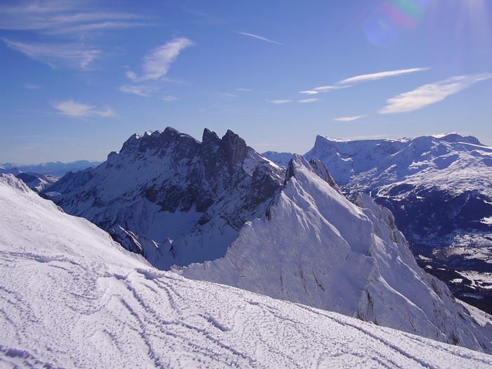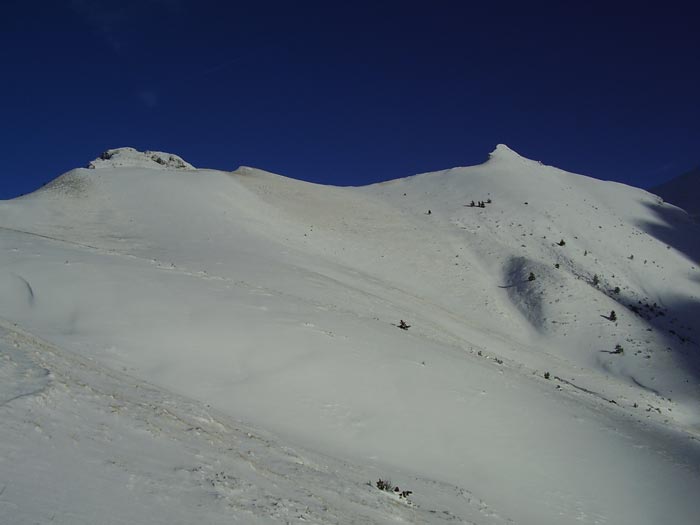 Le vent a évidemment bien soufflé par ici, ne laissant sur la croupe que le minimum skiable. Du coup, les accumulations sont faibles. A noter la présence vers 2200 de neige roulée sur une faible épaisseur. Parfois, de toutes petites plaques partent sous les skis. Dans les pentes sud, la neige est très humide, et le passage d'un skieur déclenche la descente de nombreuses boules, mais pas dangereuses.