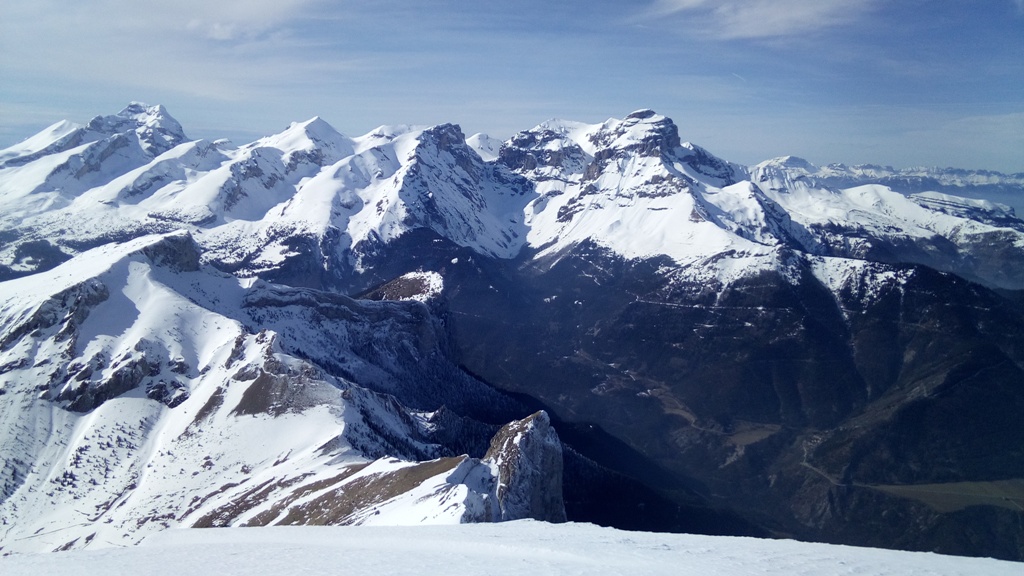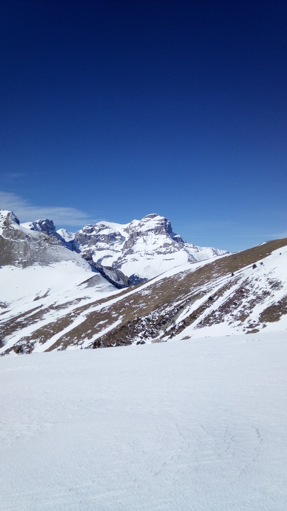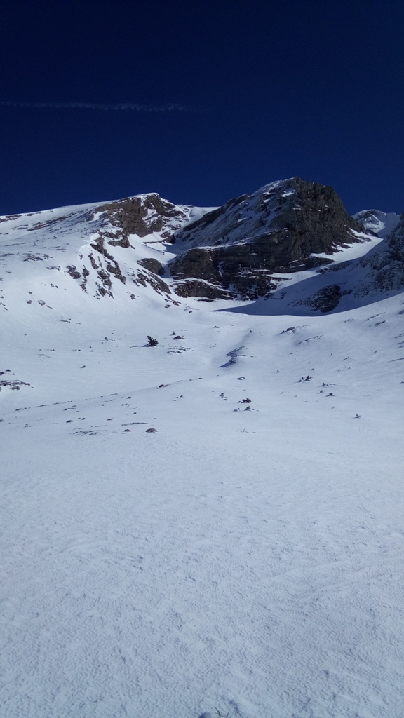 Partis avec pour objectif le couloir du ravin Pierroux, au plus je m'en rapproche et au plus je me dégonfle, l'expo 3 a l'air bien présente dans le goulet avec la traversée au dessus des barres et aujourd'hui j'ai pas envie de "prendre sur moi". Du coup je vend à Cécile la montée classique et on verra en haut. On se rend compte en montant que la neige n'a pas évolué en neige printanière en expo ouest. La descente ouest est pas mauvaise mais si la neige est du même type dans le couloir c'est pas pareil. Une fois en bas on regarde à nouveau le couloir et il semble qu'une coulée a eu lieu dans le crux du couloir on peut voir quelque chose qui ressemble à une coulée de boules, on l'a pas vu le matin mais comme la luminosité n'était pas la même peut être ne l'a t'on pas vu, surement une coulée qui a eu lieu lors des pluies de la semaine dernière. On reviendra pour le skier ou skier l'autre juste à coté. Le dévoluy est en super condition en ce moment, tous ce qui ce trouve sous Faraut est bien rempli.