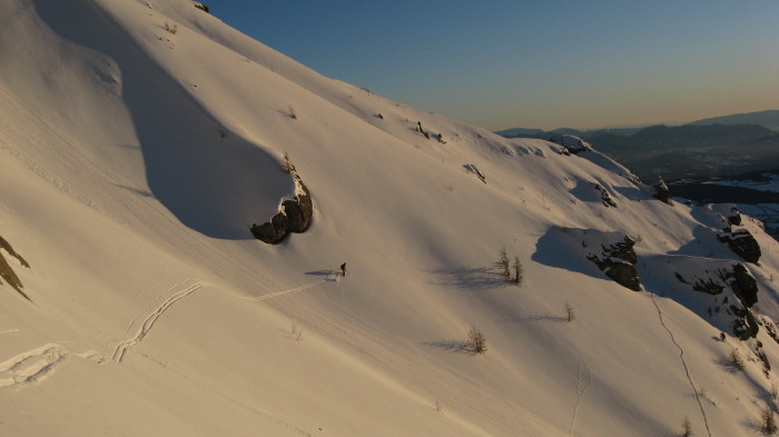 Couché la veille avec un mal de dos abominable, la douleur m'incite à la grasse matinée. Vers 11h00 le mal s'estompe et le si beau temps nous invite à un circuit ensoleillé panoramique. Partis un chouia tard, il nous manquait une bonne 1/2 h pour sortir au sommet et parfaire la boucle mais nous n'avons pas regretté ce choix car emportés par l'élan nous avons manqué le sentier et avons eu droit à une traversée, sanglio verneuse belledonnesque, aux dernières lueurs du jour...Et pis le mal au dos s'est fait oublier, j'ai trouvé le remède!