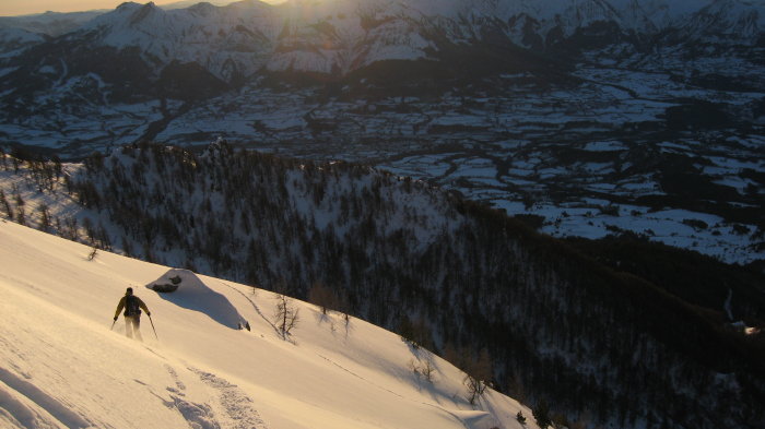 Les 2 dernières chutes de neige ont effectivement bien arrosé le champsaur. Dans les versants abrités du vent de S et d'E on trouve une quantité impressionnante de neige sans cohésion (60-70cm dans la face W du queyrel) qui part en coulée, limite en cascade sous les skis si la pente est trop raide. C'est extrement bon à skier mais peu engageant pour la suite de la saison s'il reneige sur sur ce tapis "mobile".