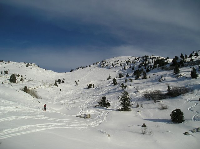L'enneigement est bien moins important que dans les autres massifs environnants. Beaucoup de cailloux. Neige dure voire gelée sous le sommet. Dans des parties protégées du soleil et du vent, il reste quelques cm2 de vieille poudre. Il faut qu'il neige!!