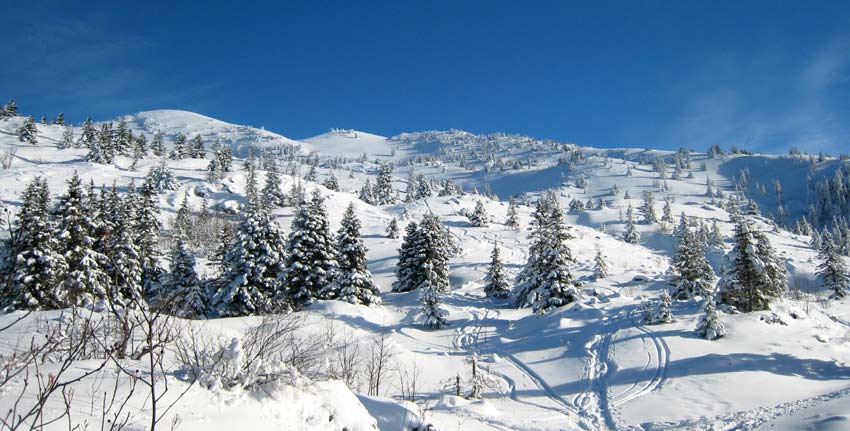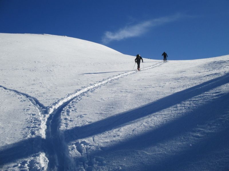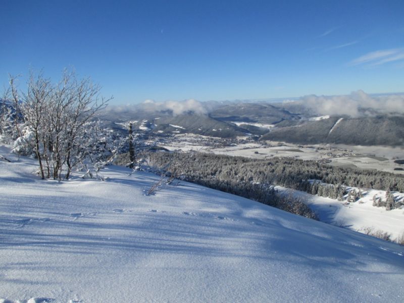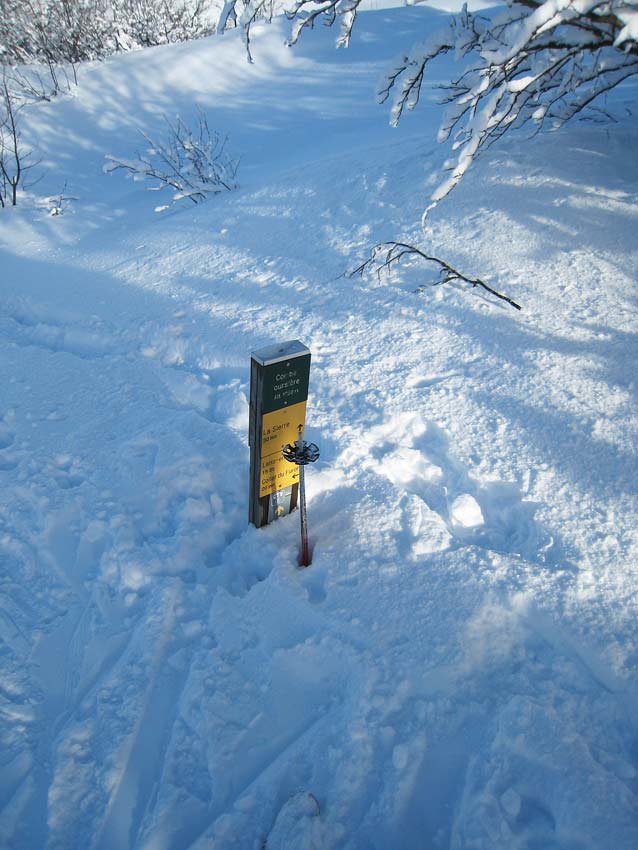 enneigement très faible en bas, mais ça passe en dehors du chemin. poudre moyennement dense très agréable à skier même avec des skis allumettes-cailloux : le genre de neige où l'enfoncement doit être équivalent avec des skis de 70 à 90 mm. Sous-couche présente surtout à partir de 1600 m sauf très ponctuellement où tout est meuble.