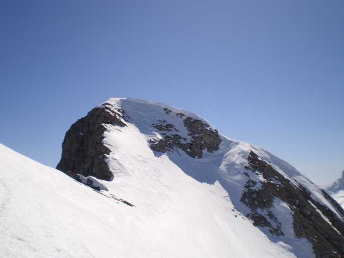 J'ai retrouvé mon piolet, vers 2300, et j'étais bien content. Cette montée un peu alambiquée et cette recherche m'ont fait perdre du temps. Du coup, j'ai débuté la descente à 13h, pensant que c'était au moins une heure trop tard. Mais finalement, j'ai été bien inspiré, car la partie raide et assez expo comportait un passage encore béton à 13h15. Dans l'ensemble, c'était très bon. Par rapport à la combe de Chabournasse, la moyenne de la pente est la même, mais comme elle est beaucoup moins régulière, il y a plus de raide, qui plus est tournant avec du rocher, donc plus difficile.