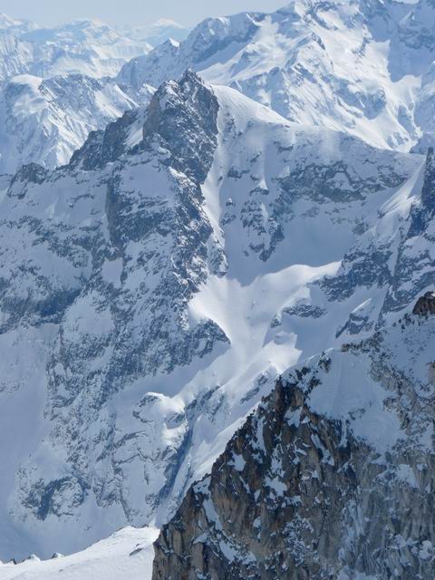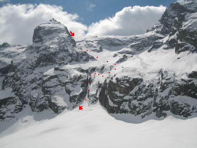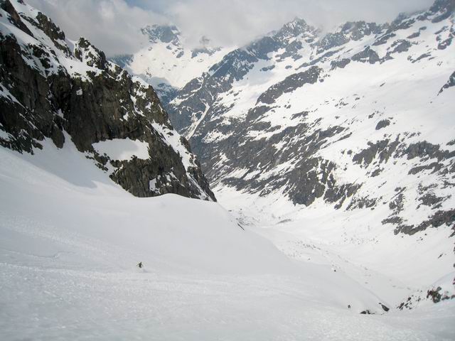 (*) Il vaut mieux sortir bien à gauche du versant nord du col Turbat, pour pouvoir basculer sur une pente de neige en sud. Car telle que décrite la sortie de A9 amène sur des barres : nous avons du tiré 35m de rappel pour prendre pied sur le versant sud.