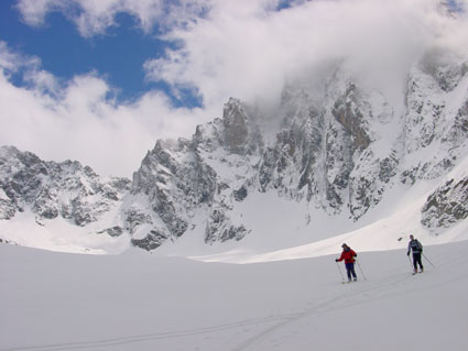 A altitude égale (2700-2800 en nord) la neige avait déjà bien changé depuis la veille (course 02-149) la poudre ayant chauffé. Partis sans objectif précis, nous avons attendu d'y voir un peu clair pour tenter pié Bérarde mais la prudence nous a fait renoncer 100 m sous le col après nous être tenus abrités derrière un rocher. Les pentes plus raides ne paraissent pas en très bonnes conditions pour le ski : col du Flambeau, col de Bonnepierre, Mayer-Dibona. En revanche le col des Ecrins parait uniformément et copieusement enneigé jusque très haut (sans doute non loin du câble). Breche de la Somme bien enneigée : un groupe l'a approché mais a fait demi-tour assez tôt. A noter portage limité à env. 15' à la descente, ce qui est le taf à cette époque même les années bien enneigées.