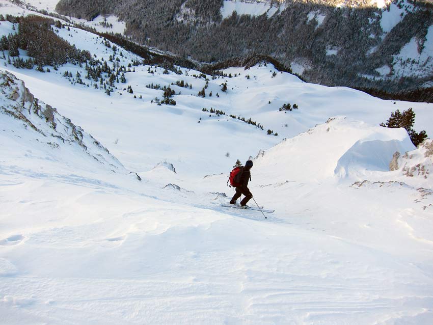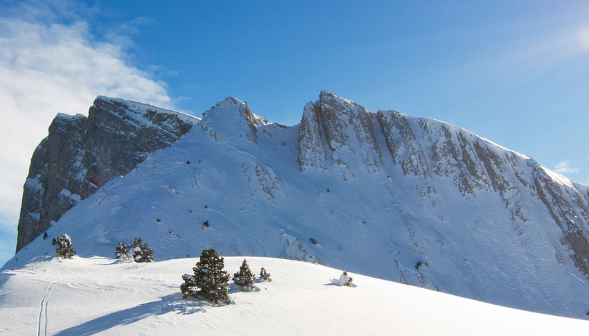 il a semble-t-il plus neigé ici qu'en chartreuse. pas de sous-couche <1500. neige plus dense et soufflée sur le haut (est, ouest). En versant ouest, là où la pluie n'est pas remontée et où le vent n'est pas descendu, les dernières chutes de neige s'additionnent en "meuble", sans croûte intercalaire.