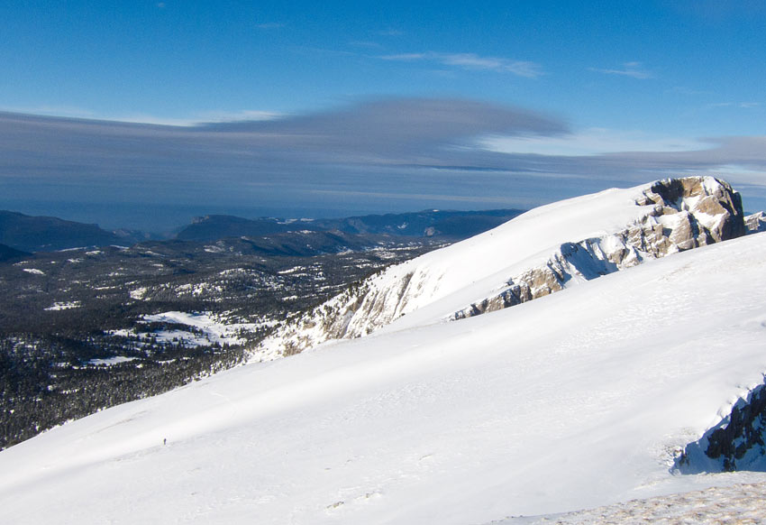J15 du sommet nord sans descendre sur le plateau, stop 1850. retour par sommet sud puis pas de la ville. le chemin est inskiable <1450 m mais on peut arriver en bas à skis sans toucher (de cailloux) par la forêt puis la piste de fond. Comme ailleurs la forêt est cependant peu garnie.