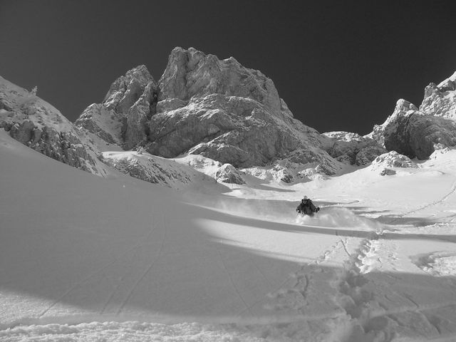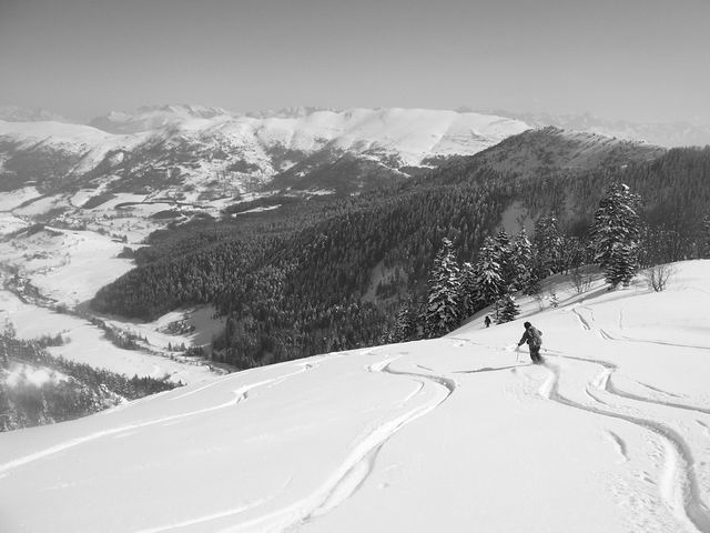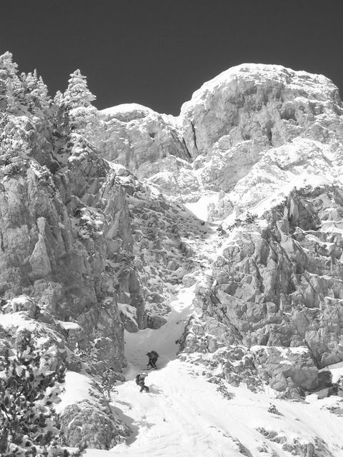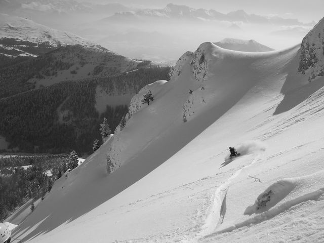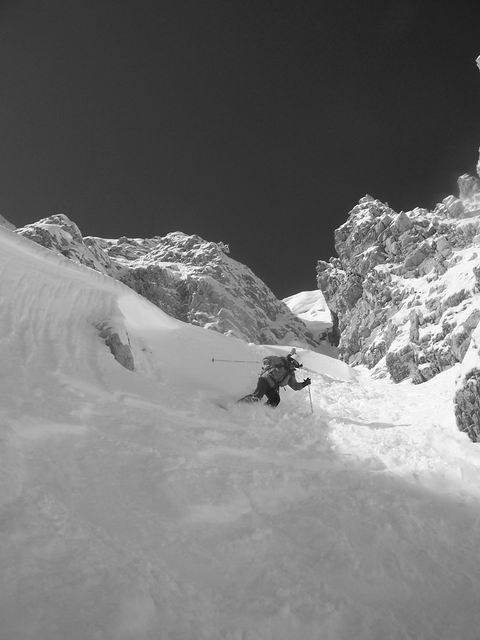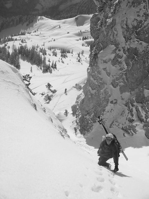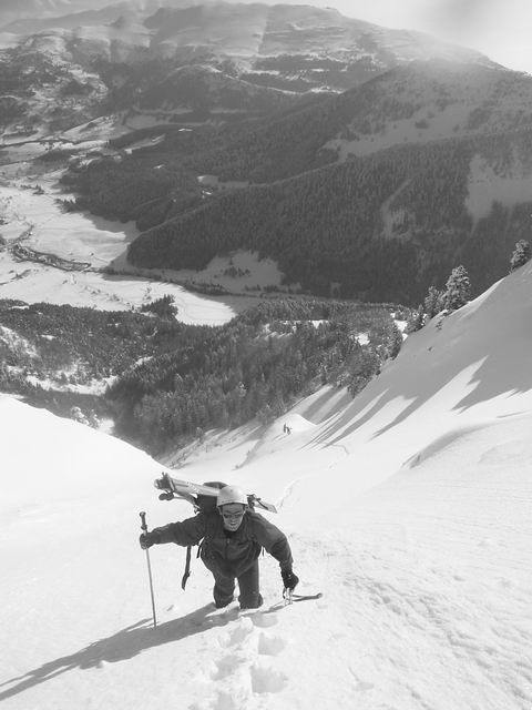 Montée très efficace pour accéder à cette face par ce petit ressaut qui passait bien ce jour, mais qui met d'entrée dans le vif du sujet. A noter que cette face est Est froid, le problème vient plus de la bordure rive gauche qui doit vite purger et pourrir le couloir. Sinon la barrière orientale du Vercors est d'une blancheur extraordinaire, c'est difficle d'en détacher le regard. Et les photos sont encore en N&B, arghhhh y'avait des couleurs aujourd'hui, disons que c'est par hommage au topo ODA !