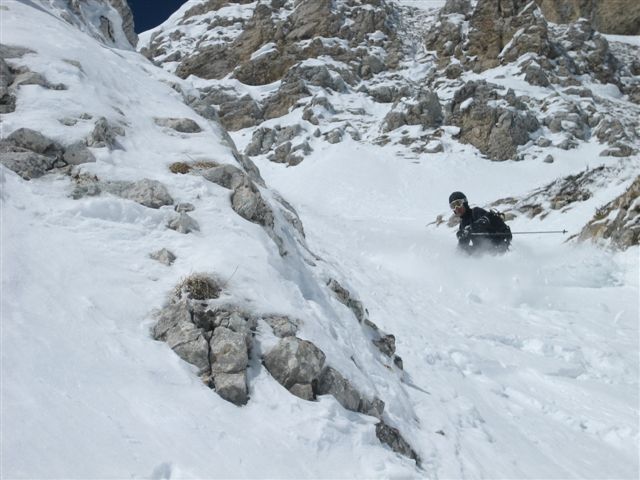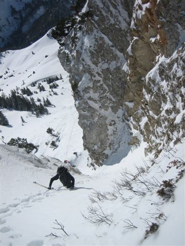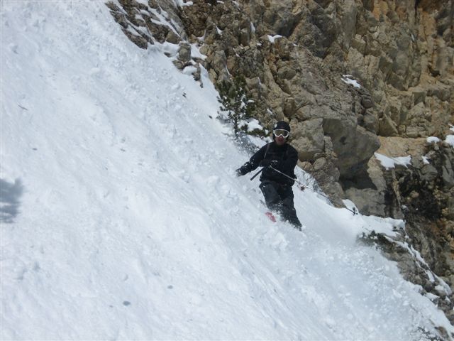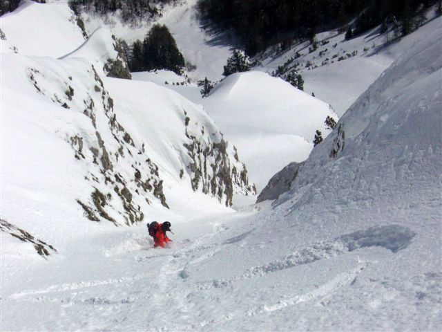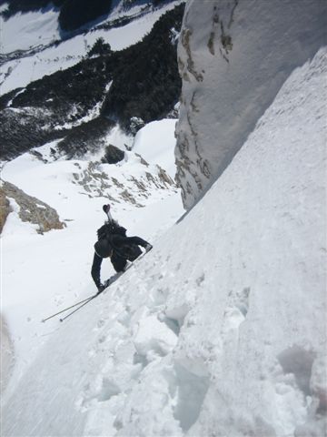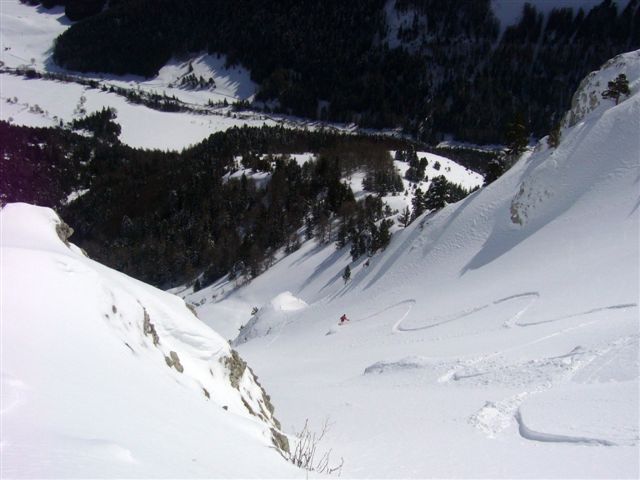 Après un but en janvier avec XAG et Eric je guettais le moment pour y retourner dans de bonnes conditions. C'est chose faite, on ne pouvait pas raisonnablement éspérer mieux. La rampe d'accès est bien remplie et se skie sans problème. Au-dessus c'est tout en poudre, un régal. Nous n'avons pas sorti la corniche, elle est très surplombante et ne nous inspirait vraiment pas. On a chaussé juste en dessous.