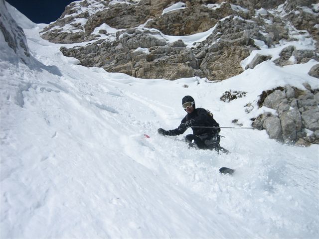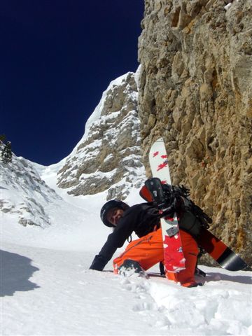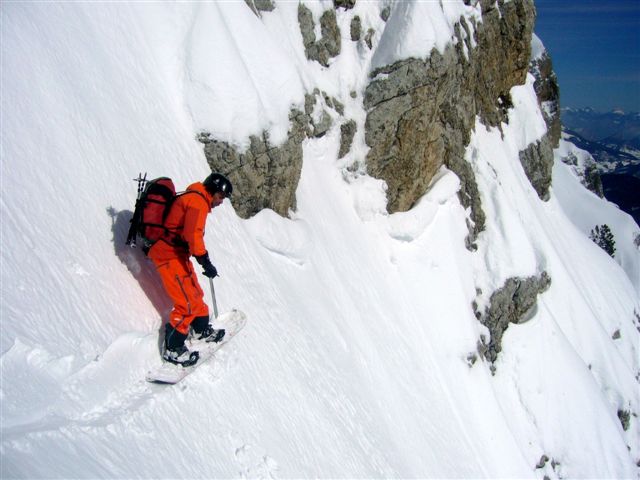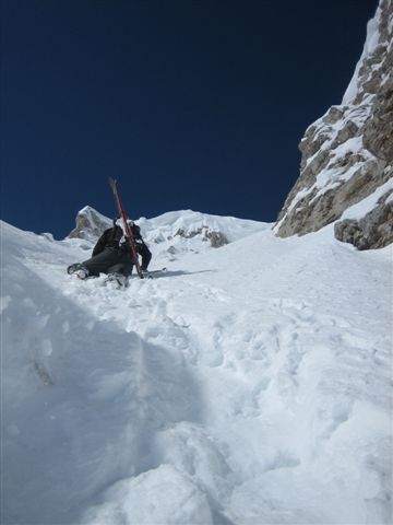 Dans la face suspendue il y a 30 à 60 cm de poudre en cours de tassement. Puis dans le goulet plus on monte moins il y en a mais ça ne descend jamais en dessous de 20 cm de meuble. Dans le haut du couloir, de petites plaques de 10 cm d'épaisseur partent sous les skis/surf.