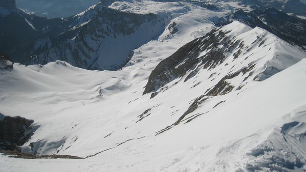 Pour la Nord Est du Petit Veymont c'est une autre histoire... Je me suis engagé dedans malgré son aspect car sous la corniche c'était grain fin, 50m plus bas c'était béton vitrifié... Demi-tour et remonté en plein cagnard de la Face Sud et retour sur Gresse pas l'autoroute de la voie normale du pas de la Ville. La neige n'est pas mauvaise dans cette descente (trop mou vers 1h), mais encore de la poudre à l'ombre.