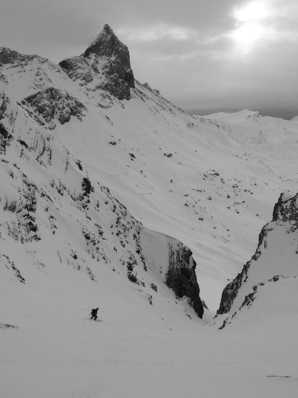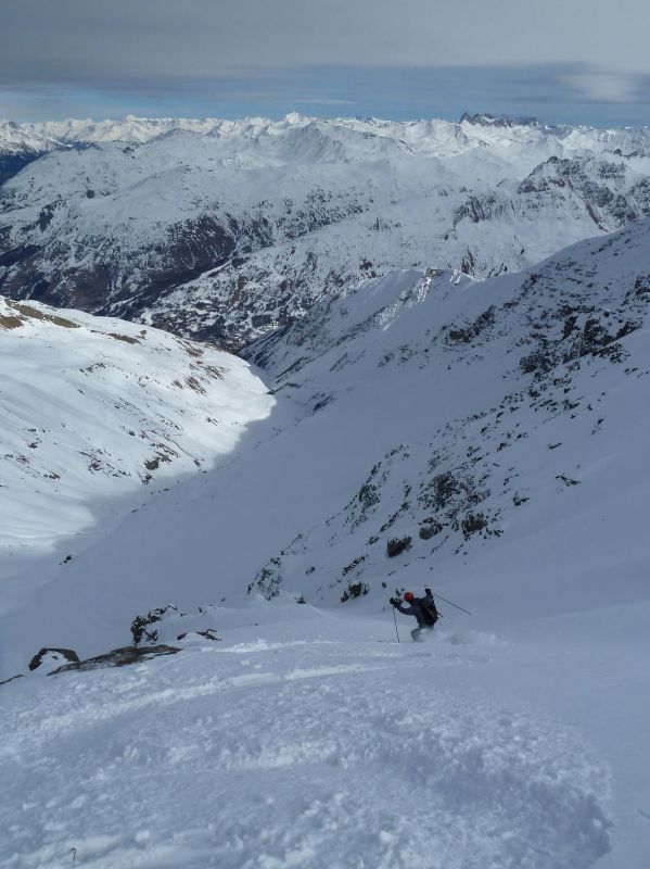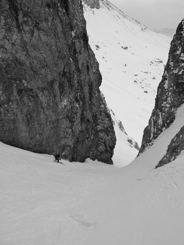 En s'engageant en face NE de P.Fendue, j'ai déclenché une plaque 50 m sous le sommet, au niveau d'une rupture de pente (45°), sur une dizaine de mètres de largeur avec une cassure de 30 cm. La plaque s'est déclenchée après le premier virage, j'étais donc sur la zone en mouvement, emporté vers le bas. J'ai réussi à me mettre dans le sens de la descente, puis immédiatement viré à gauche en visant une zone plus rocheuse. Tout s'est passé très vite, les réflexes ont à priori été les bons. Certes le volume était faible, mais les conséquences auraient pu être plus lourdes (non pas ensevelissement, mais chute).