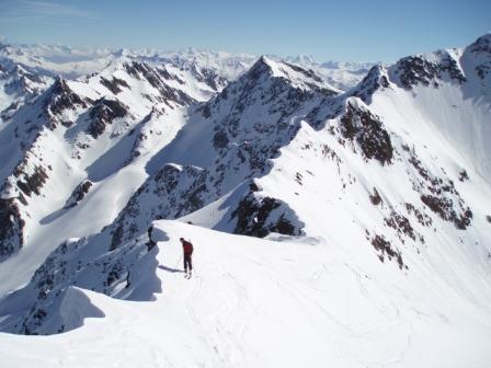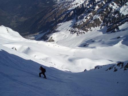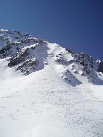 Super conditions, peut être un peu carton sur le bas de la face N. Au moins 6 personnes derrière nous. Ca chauffe vite en face sud, l'arête du col 2750 au sommet par la face sud peuvent vite devenir piègeux avec des barres pile sous le sommet.