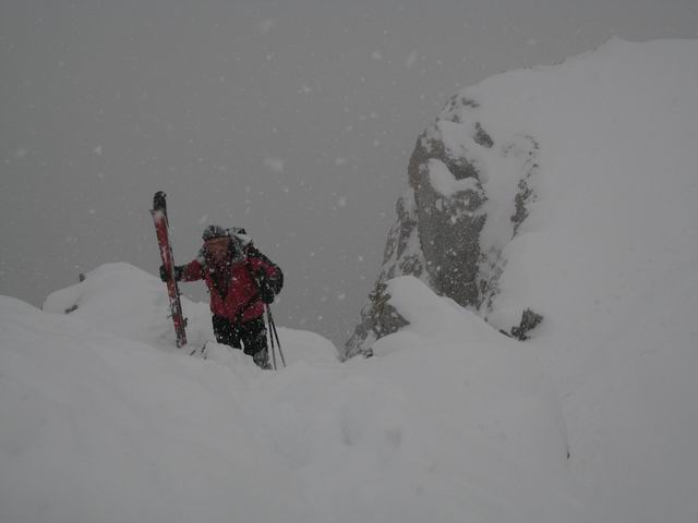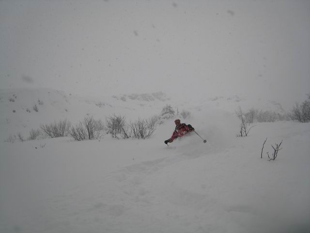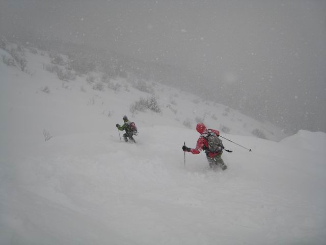 Bruit de tassement sous les skis dans la pente du haut, mais normal vu l'épaisseur de neige meuble. On ne s'est pas attardé à faire un sondage mais le vent ne semble pas avoir travaillé à ces altitudes. Sinon, poudre de cinéma de haut en bas