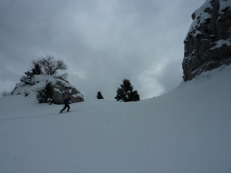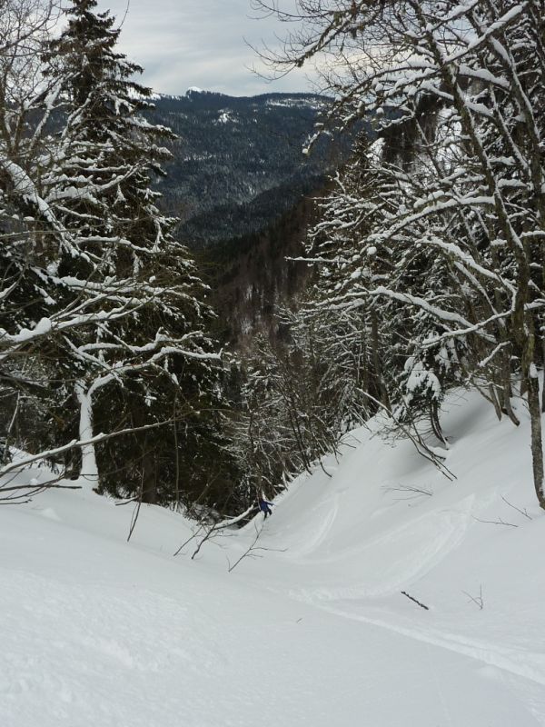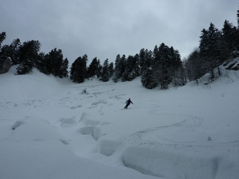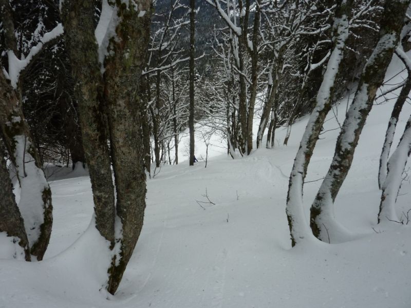La neige est restée bien froide dans le Vermorel, à peine densifiée et bien protégée du vent. Les quantités sont tout à fait correctes pour permettre une descente agréable sans trop de crainte d'enfourner un ski sous une branche. Sous le mont Fromage, une belle coulée déjà ancienne, entre la plaque et la reptation, occupe une bonne partie de la clairière.