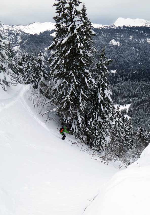 La deuxième salve de mars (7-8) a augmenté le stock de 25-30 cm de poudreuse. Elle est restée légère sauf en plein est (et probablement sud). Bonne laison des couches et apparente stabilité même à 40°. Le vent de sud de l'apm n'a pas été ressenti ici. Une amorce de reptation en nord-est du montfromage. Autres amorces de reptations en versant est, partiellement recouvertes