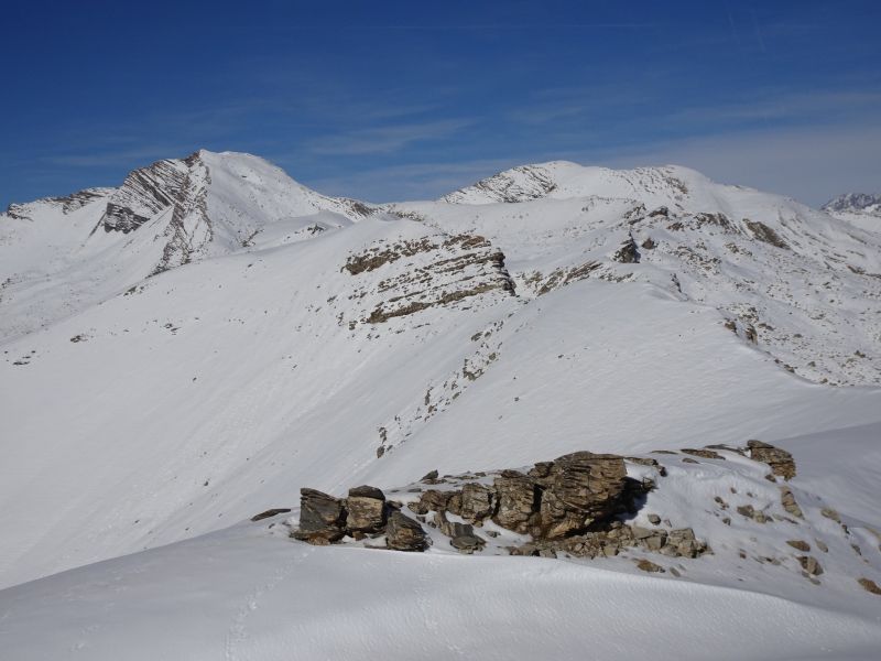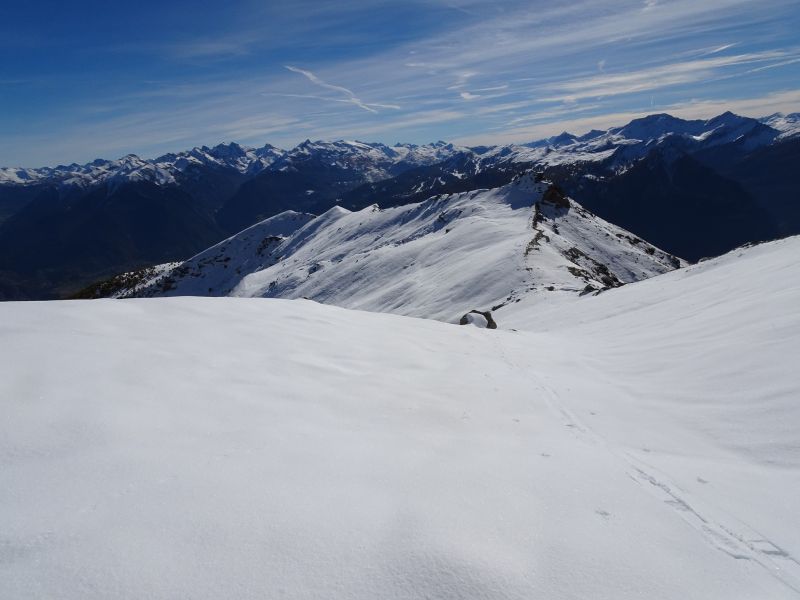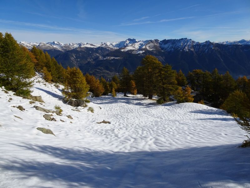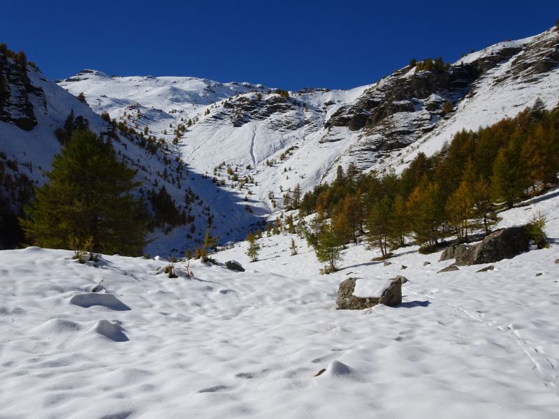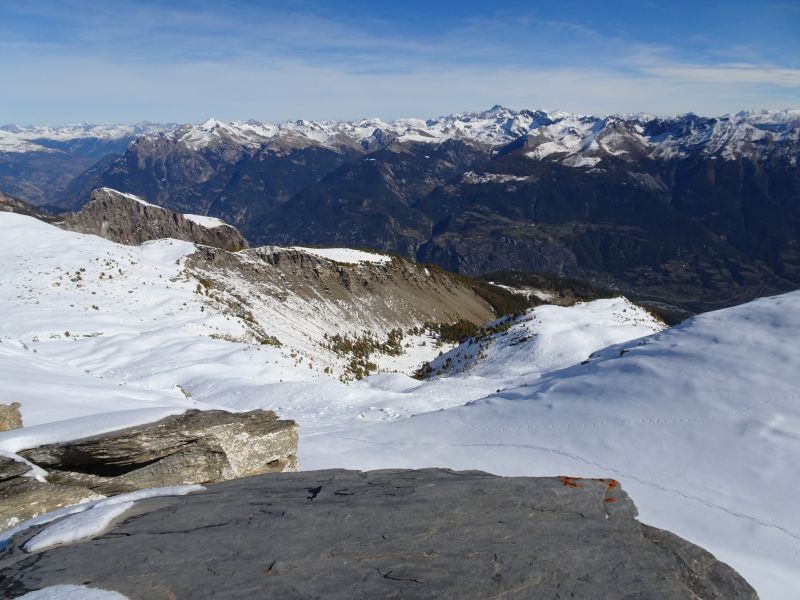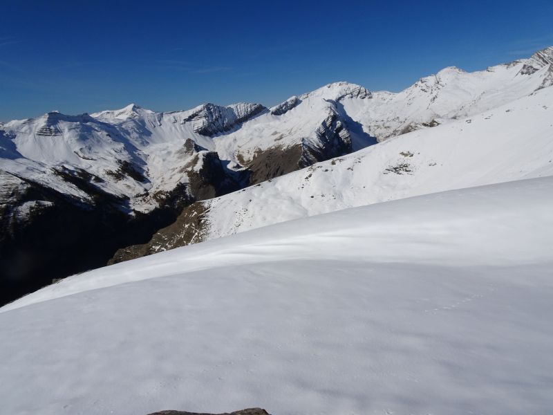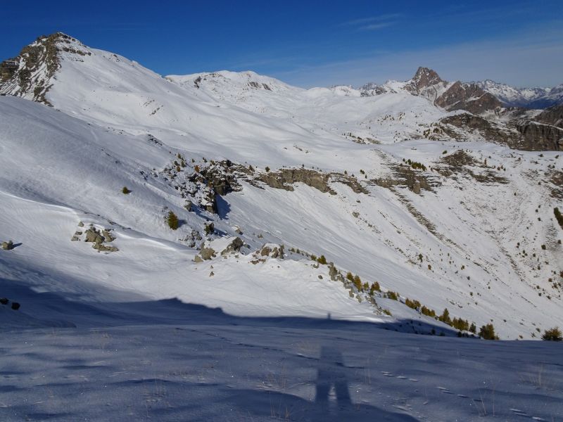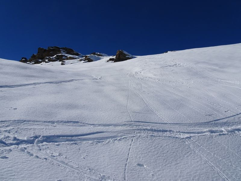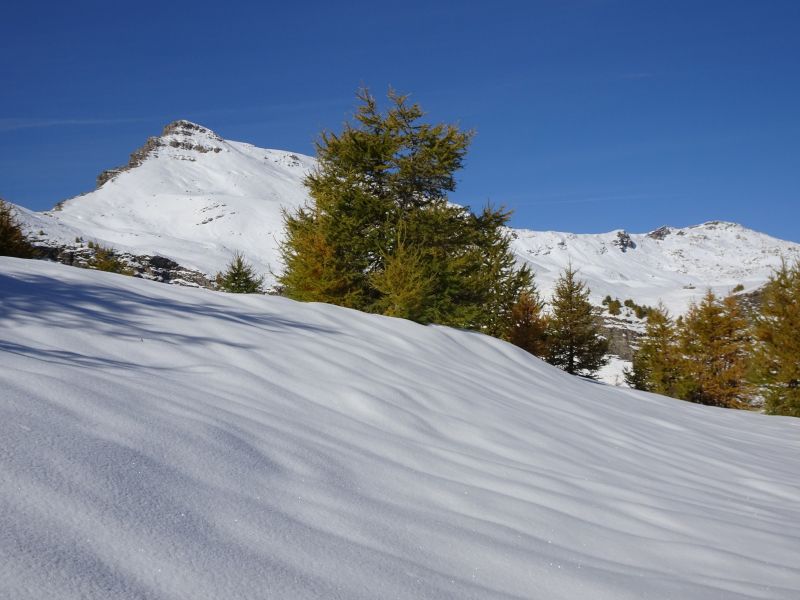 Neige plus abondante et plus basse qu'en Queyras. Transformée sauf dans les contre pentes très froides. Relief bien empâté par cette couche (deux couches en fait) tombée très mouillée au début. Au dessus de 2300 neige lisse mais au dessous beaucoup de reliefs (rigoles et bosses).