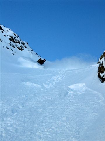 Couloir bien rempli avec la neige des rives accumulée mais l'ensemble a une bonne cohésion.