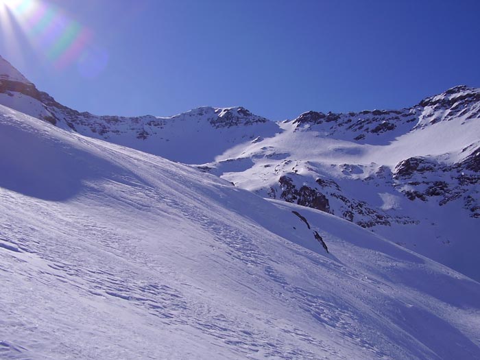 J'avais prévu d'aller à l'Entre-Piniers, mais j'ai finalement décidé de suivre Jean-Luc et Pierre, à mon avis mieux inspirés, vu la qualité de la neige dans les endroits froids. Ils m'ont raconté en détails les circonstances du sauvetage du skieur enseveli à la Coupa en début de saison : c'est renversant, et on se dit que la mort ne voulait vraiment pas de lui ce jour-là ! Il a dû son salut au fait qu'un couple de skieurs, stationnant pile 40 cm au-dessus de lui, ont tripoté leur ARVA, le faisant passer en réception, juste à ce moment-là ! Jean-Luc m'a dit par ailleurs que son fils avait suivi les cours d'un certain Lionel Tassan dans le coin... Des skieurs au roc Diolon et à l'Entre-Piniers, pas si mal à ce qu'on nous a dit. Si Jean-Luc me lit, qu'il n'hésite pas à faire des rectifications en commentaires, car je ne suis pas très sûr d'avoir bien identifié le sommet.