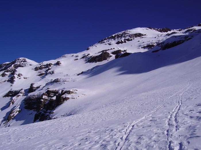 L'itinéraire est le même que celui du grand Pinier jusqu'au replat vers 2600. Là, on tire à gauche, direction NO vers un sommet arrondi évident dans l'axe, qu'on gravit par un droite-gauche qui amène sur l'arête finale sud, confortable. À la descente, afin de chercher une neige un peu meilleure, nous avons tiré à droite et rejoint l'itinéraire du col des Jalabres vers 2800. De là, descente vers le lac des Pisses où nous avons emprunté l'itinéraire du roc Diolon, puis l'itinéraire de montée. Déchaussage vers 1585, et on peut rechausser vers 1540 pour finir à skis.