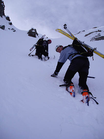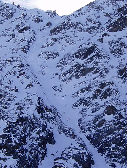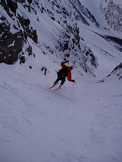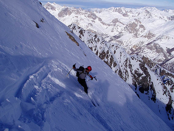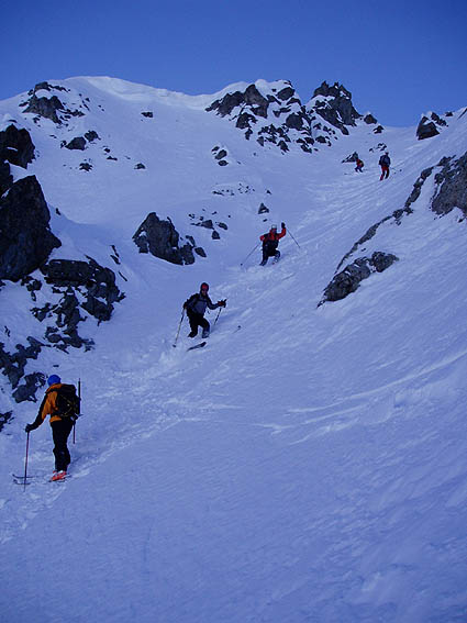 Une bien belle journée dans ce secteur qui fourmille de couloirs. On ne sait plus où donner de la spatule. Nous avons remonté le premier couloir afin de se rendre compte des conditions puis enchaîné ensuite avec la brèche du Casset qui avait déjà été tracée. Au final, du bon ski et une collective bien sympathique malgré la qualité changeante de la neige et la météo qui a mis le temps avant de s'améliorer. A noter que le haut de A18 est encore peu rempli d'où un dérapage sur 30 mètres > 45°. Le briançonnais est vraiment bien enneigé comparé à l'Isère. Même en versant sud, la neige est basse ; par exemple on part en peaux du pont de l'Alpe. Pas mal de traces (et de voitures garées) un peu partout mais personne dans ce vallon dérobé entre le Petit et le Grand Tabuc.