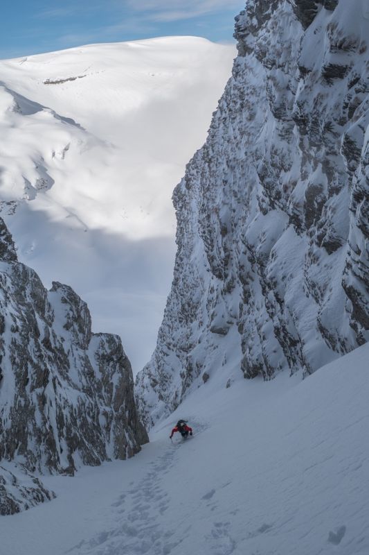 Nous n'avons pas visité de pentes >30° mis à part le couloir ultra encaissé au ratio montée/descente (1h15 vs 5 min) pas très rentable