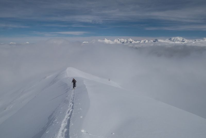 Tête du Château depuis Brion avec fin comme J7, descente nord-est, couloir en AR puis ski jusqu'à 1850. Re-tête du Château, descente ouest sur chalets Méry, pointe du Château, descente finale couloir de Brion.