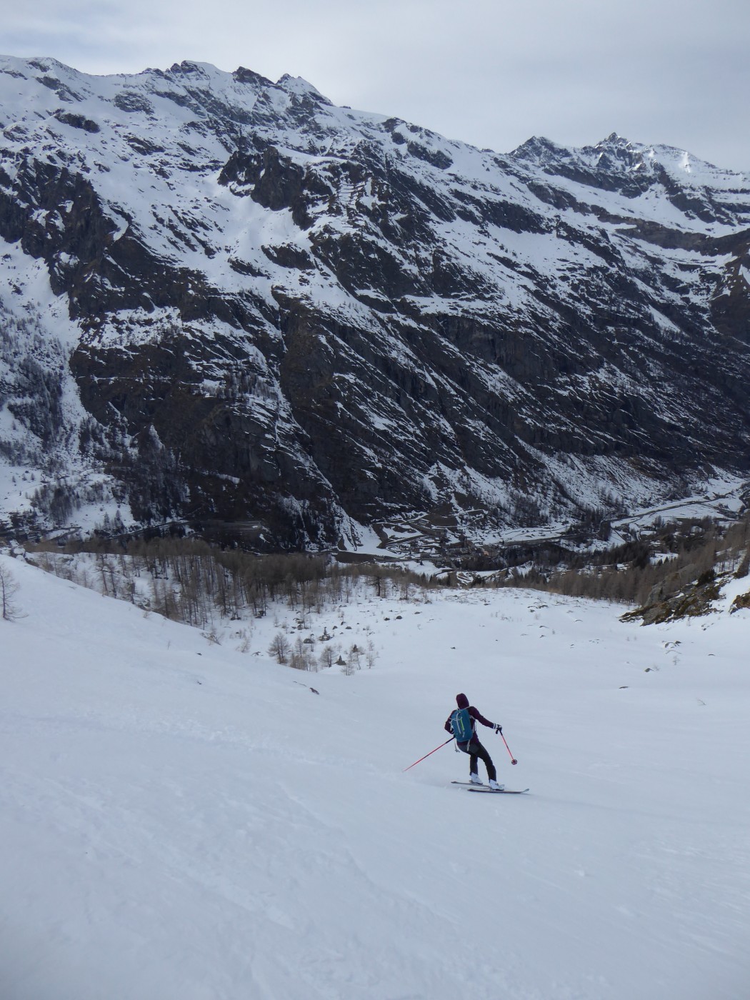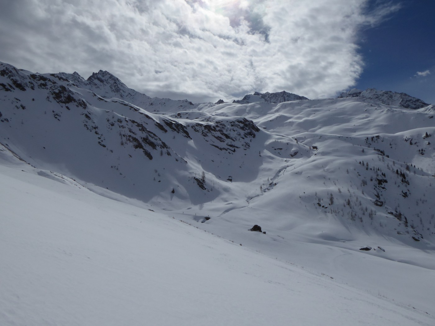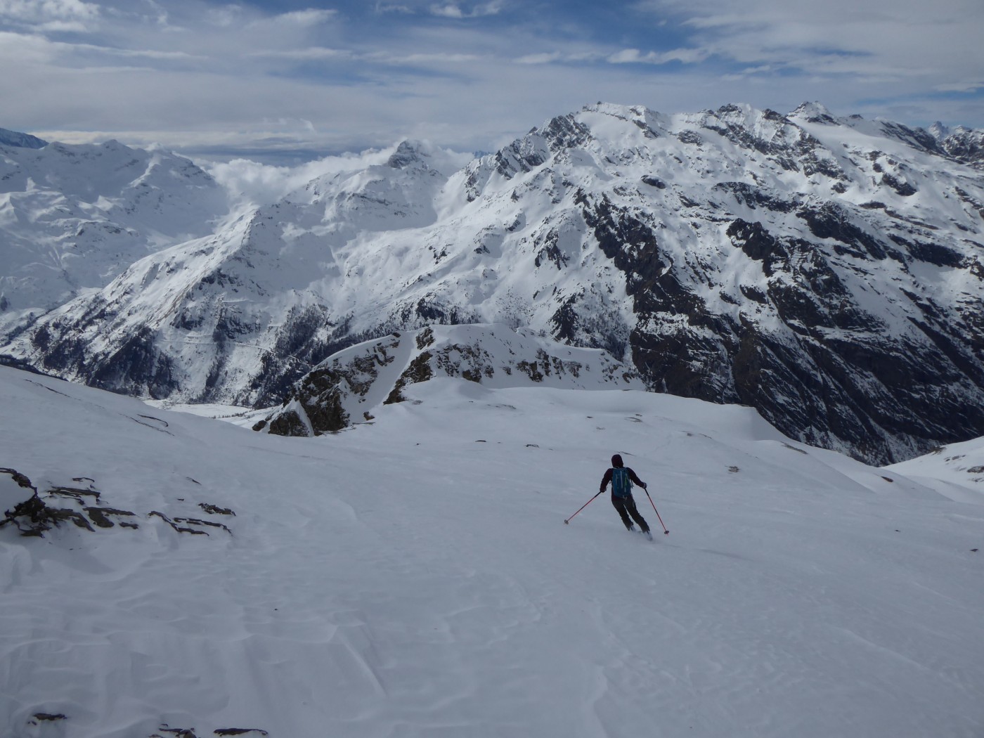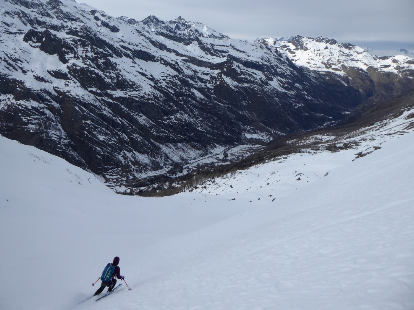 Bonnes conditions dans le couloir sud avec la petite couche de neige fraiche sur fond dur. Le retour par les pentes nord-ouest du bec des Quatre Dents est moins bon, avec une neige irrégulière. Le manteau neigeux étant peu épais dans le bas, la fin de la descente nécessite de composer avec les vernes. Secteur calme malgré les nombreuses possibilités : trois skieurs au Sigaro (B22.2), trois au col de Cussuna (B22) et deux à la pointe de Feluma (B23). Quelques déposes vers le fond de la vallée, vraissemblablement à la becca di Giasson (B18). A noter que dans le val de Rhèmes voisin, le refuge Benevolo ouvrait ce week-end.