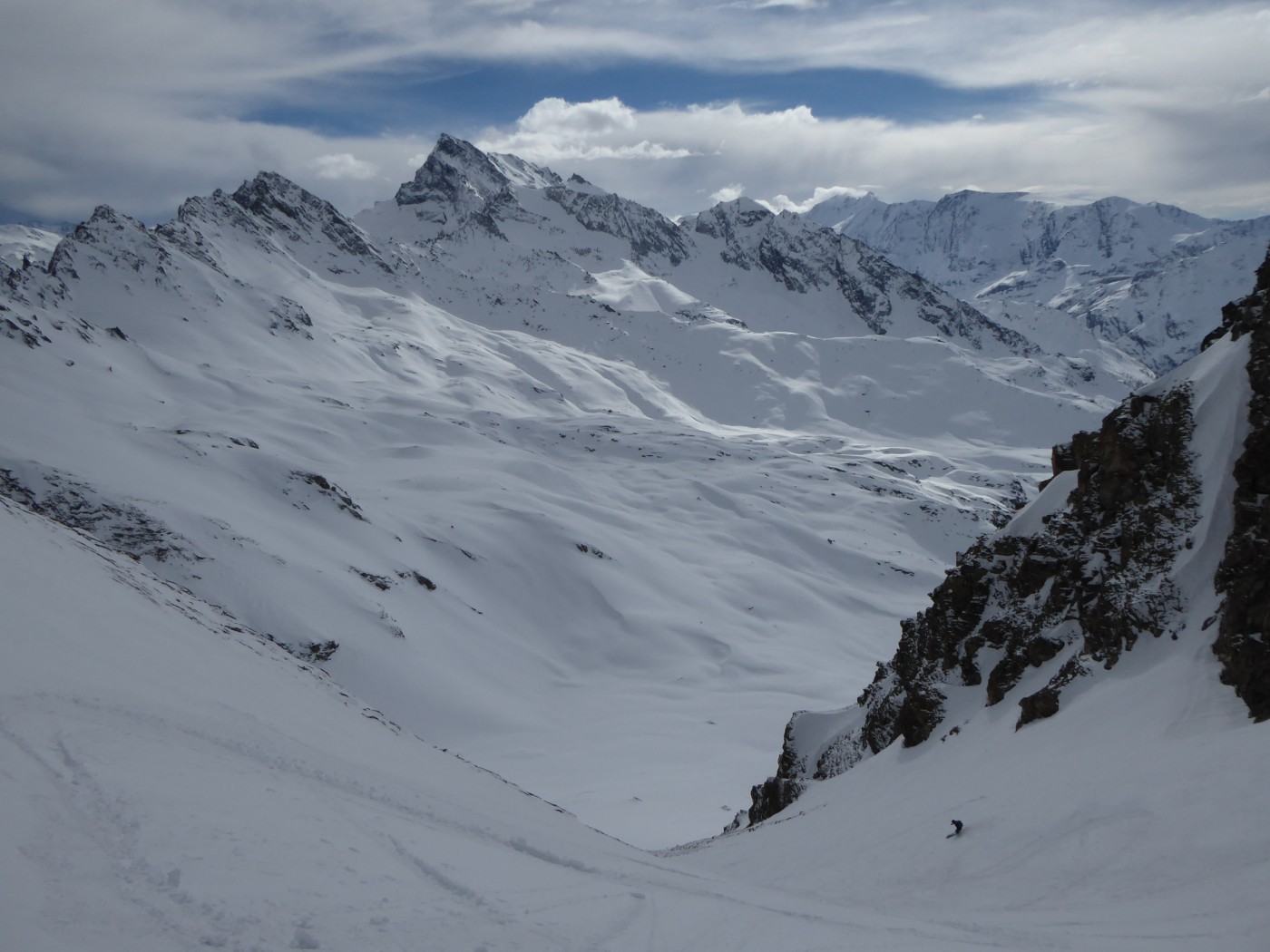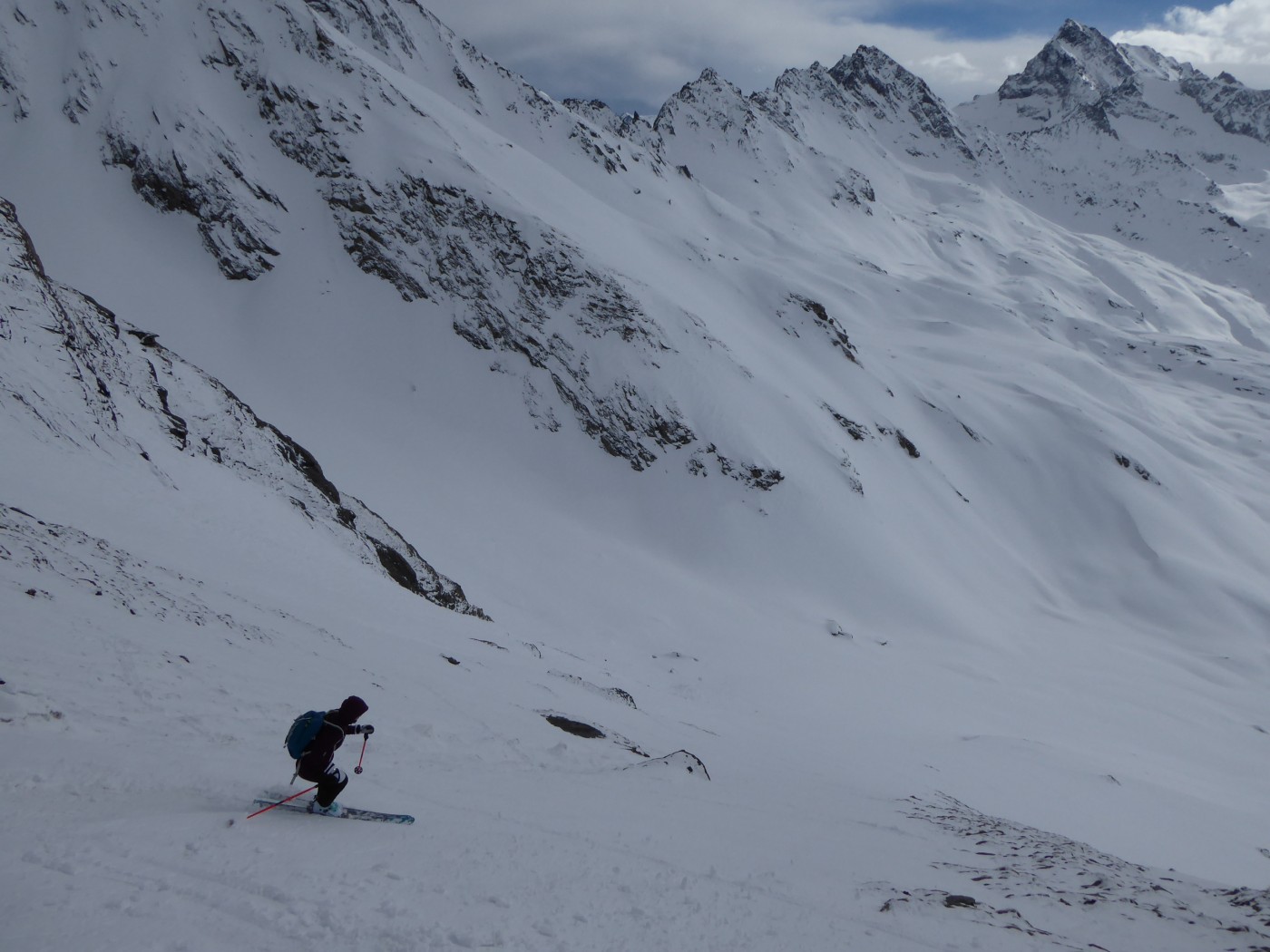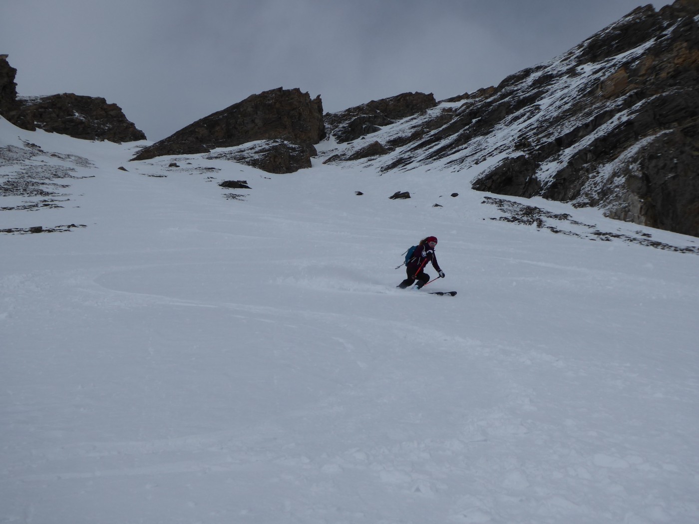 Bonnes conditions dans le couloir sud avec la petite couche de neige fraiche sur fond dur. Le retour par les pentes nord-ouest du bec des Quatre Dents est moins bon, avec une neige irrégulière. Le manteau neigeux étant peu épais dans le bas, la fin de la descente nécessite de composer avec les vernes. Secteur calme malgré les nombreuses possibilités : trois skieurs au Sigaro (B22.2), trois au col de Cussuna (B22) et deux à la pointe de Feluma (B23). Quelques déposes vers le fond de la vallée, vraissemblablement à la becca di Giasson (B18). A noter que dans le val de Rhèmes voisin, le refuge Benevolo ouvrait ce week-end.
