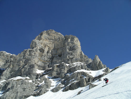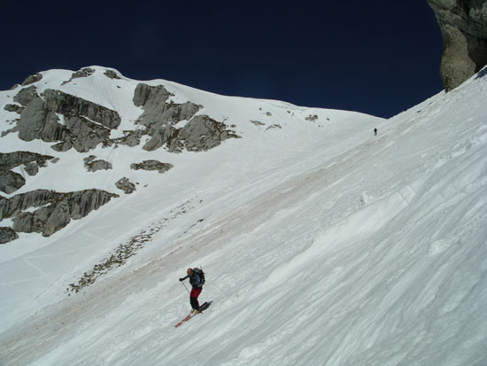 Mauvais regel, les pentes sud à 10h sont en soupe profonde, la face Ouest était tranfo moquette à 10h30. Des décrochement de fond dans les pentes ensoleillées.