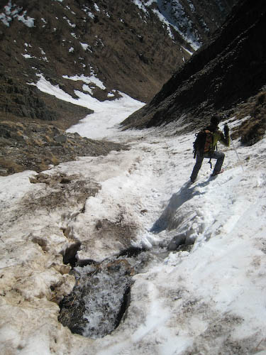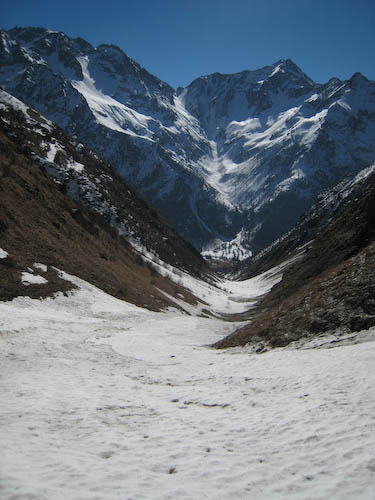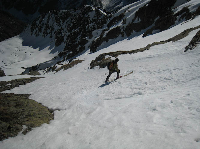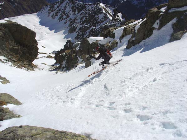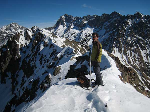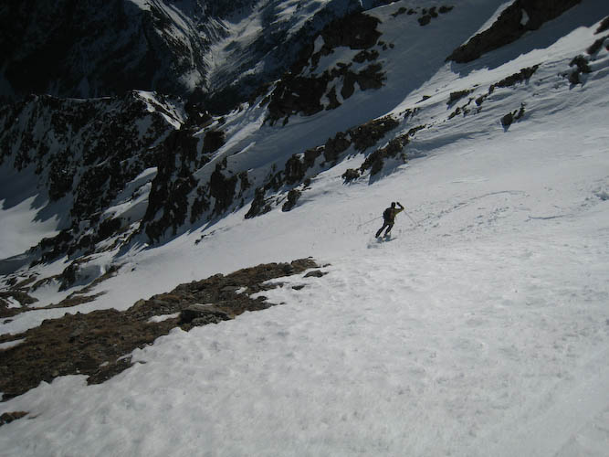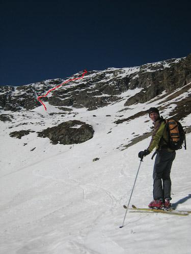 Comment transformer un coup foireux en coup de maître. Nous vision le Pic de Valsenestre, chanté par Volo dans le toponeige. Il s'est avéré que l'objectif initial est passablement déneigé (SE) malgré l'altitude, alors que ce qui allait devenir une belle course (E) nous semblait déjà bien meilleur vu du bas. Bien que nous n'ayons aucun renseignement sur cet itinéraire, cela a marché. La lecture de l'itinéraire n'est pas facile