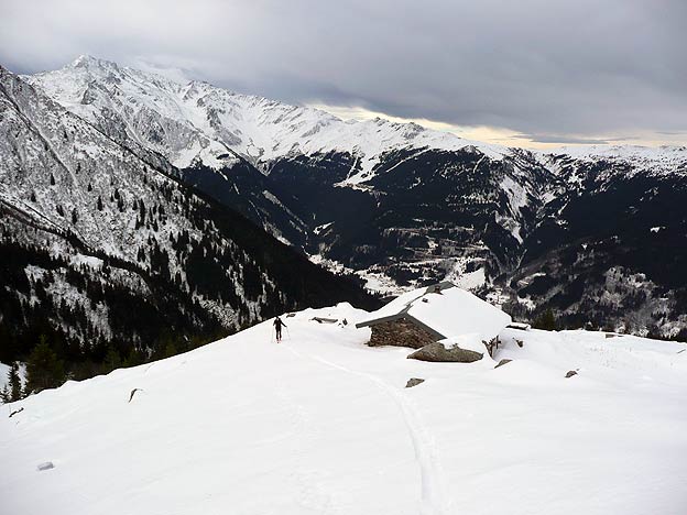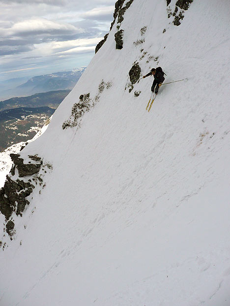 Le foehn est en train d'assainir la sous-couche jusqu'à 2500 m au moins, à moins qu'il ne la fasse totalement disparaître. Qualité de ski bonne dans le couloir et dans le cône, correcte en-dessous jusqu'à 1800 m. Sous 1800 m, on fait bien gaffe aux nombreux blocs et sous 1500, skis-cailloux recommandés. Déchaussage final à 10 min du parking à 1250 m.