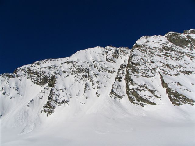Concernant E6.4 : on a pas tout compris. C'est pratiquement que du cailloux recouvert de neige en train de boulotter et ça semble tortueux mais pas très raide. Doit rarement s'enneiger. Du pied de la face, le seul itinéraire logique est celui descendu.