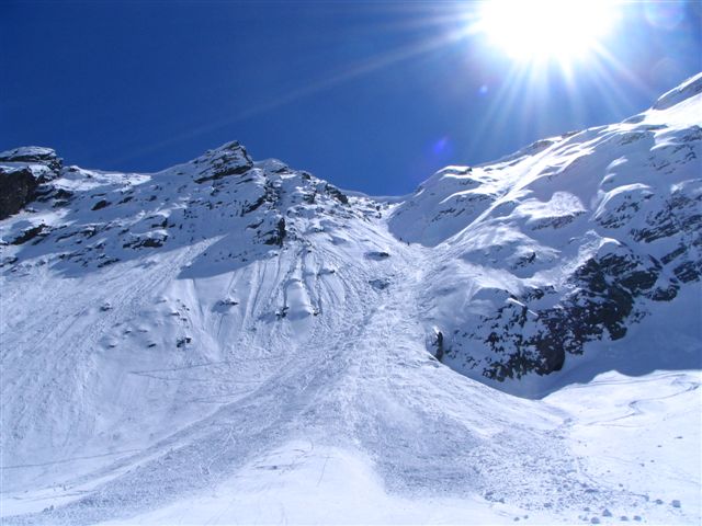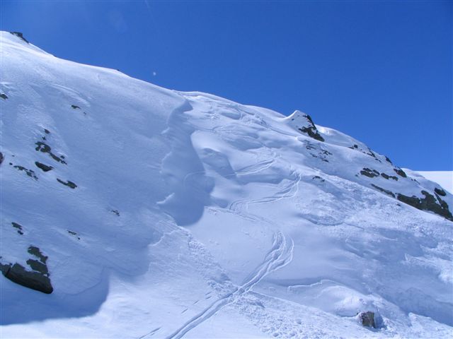 Transfo sous 2400. Au dessus, le processus de transformation est à peine entamé, et ça reste poudreux en N et NE ( 20-30 cm tombé le 04/04/07. Attention, les versants NE sont plaqués : aucune cohésion de la dernière chute avec la sous couche, nombreuses plaques visualisées ( et même déclenchée dans une contrepente sous le glacier de la Leisse!). Le haut de B17 paraissait également plaqué et on a pas insisté.