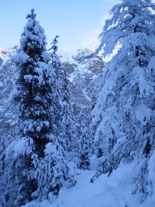 Tracer près de 1600 m dans 35 cm de poudreuse n'a pas été de tout repos. Mais les conditions étaient superbes, les arbres encore chargés de poudreuse, dont beaucoup étaient en travers, un petit vent de sud en quittant la forêt, plus fort en arrivant sous le sommet, une neige idéale sur toute la descente... malheureusement, en absence de sous-couche sous 2200 et avec une sous-couche trop fine au-dessus, et même avec des skis cailloux (indispensables !), on skie au ralenti. J'ai touché plus de 20 fois, sans trop de gravité. Vu personne aujourd'hui, à l'exception d'un gros chien gueulard mais bonnasse au chalet de l'Ubac de l'Aval.