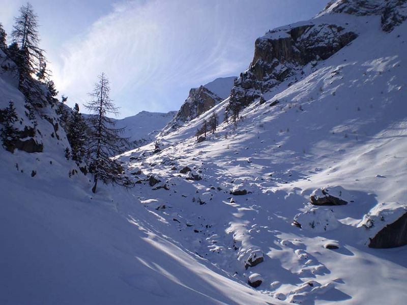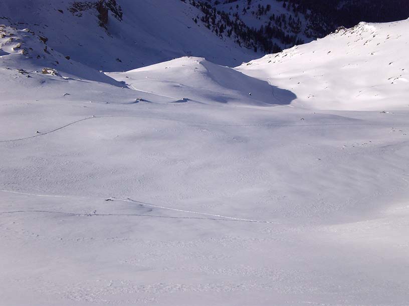 Les chutes de neige récentes n'ont pas été trop fortes dans ce secteur et elles n'ont pas été ventées : on a donc une bonne cohésion de feutrage sur tout l'itinéraire, à l'exception des 100 derniers mètres où le vent a soufflé. Les températures étant restées froides, sans excès, pas de purge ni d'humidification du manteau. La liaison entre cette poudreuse et la sous-couche regelée, quand elle fait son apparition au-dessus de 2000-2300, est mauvaise. Dans les pentes raides, ça ne tient pas. La fin est plaquée, mais la pente ne dépasse pas les 30 degrés, sauf sur de courts passages. Mais il y a beaucoup de cailloux, ce n'est pas franchement skiable et j'ai chaussé un peu sous 3000 (3020 sur mon alti, mais ce ne peut être qu'une erreur).