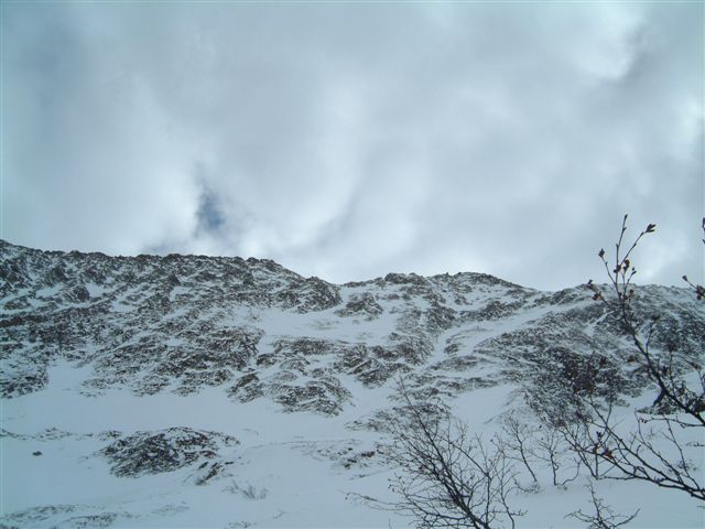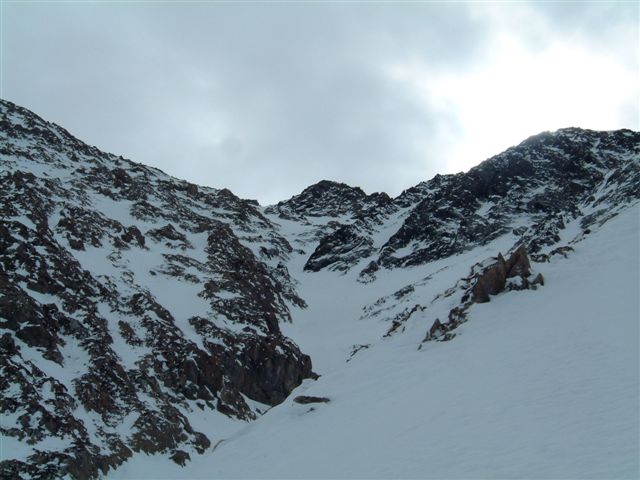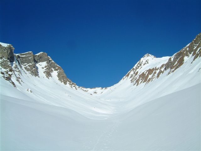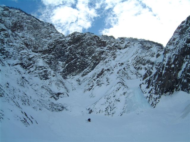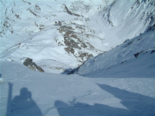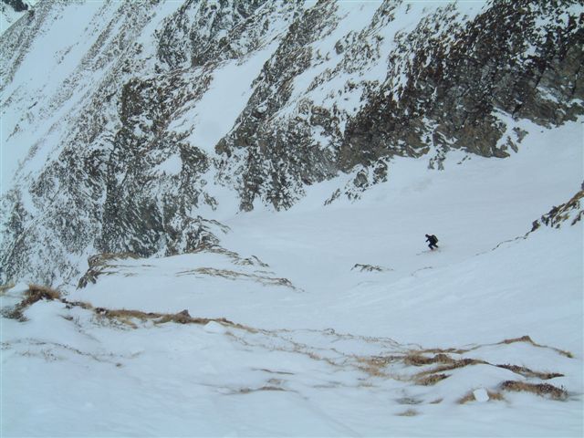 Quelle bavante à vue : 3h de descente ( recherche d'itinéraire,stress incessant sur la suite de la descente, neige collante sur la route ). De l'assez bon ski dans le couloir mais à vue par ce faible enneigement, c'était assez gonflé, même si la corde est restée dans le sac. Et heureusement que j'avais déjà remonté l'année dernière le ruisseau. Itinéraire très sauvage. La pente n'est jamais très raide, mais c'est long : 800m entre 40 et 45° ( quelques courts passages > 45° ). Cot proposé : 5.1/E3. Avec un meilleur enneigement, il doit être possible de ne pas déchausser.