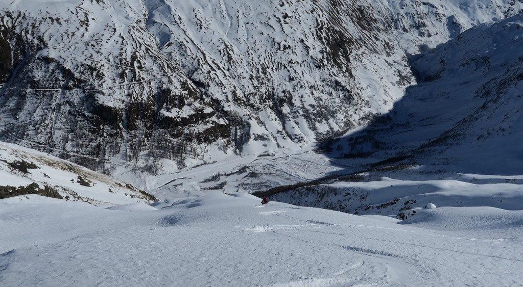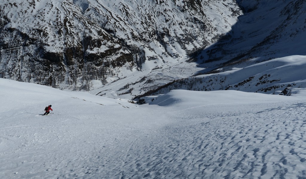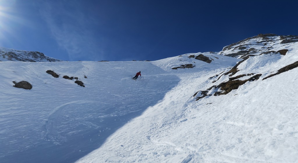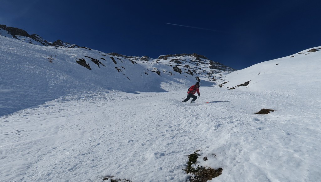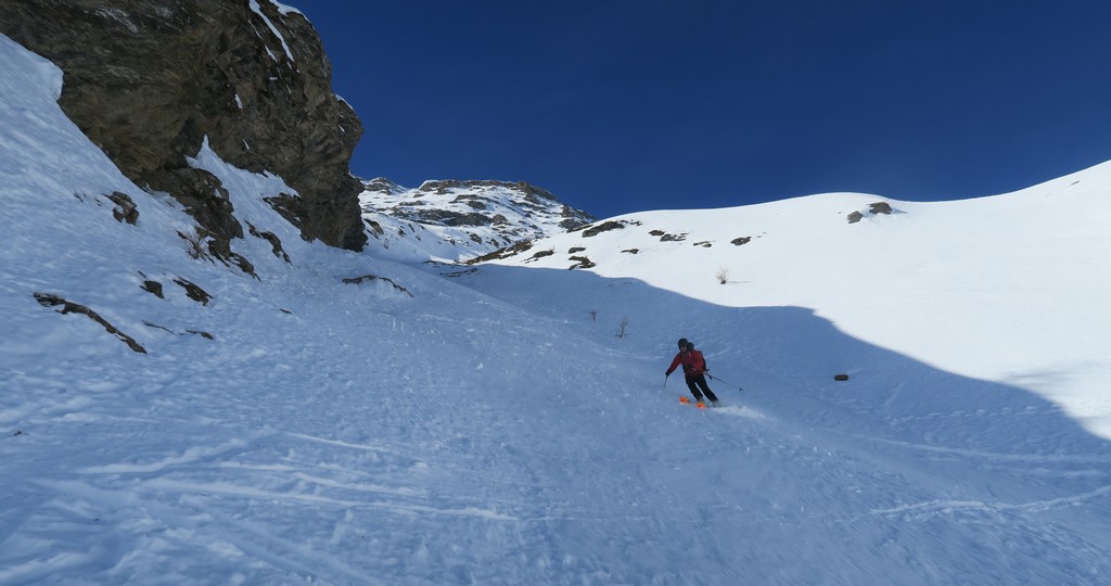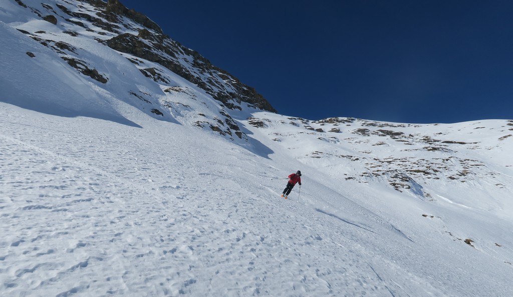 Cette face à une bonne composante nord où le soleil ne tape pas trop encore du coup la neige y est restée froide. En plein est c'est transfo et ça se pourri vite mais rien d’inquiétant à l'heure de notre descente. Les grandes pentes plein est directement sous le sommet avaient elles purgé ces derniers jours mais ce n'est pas elles qu'on emprunte.