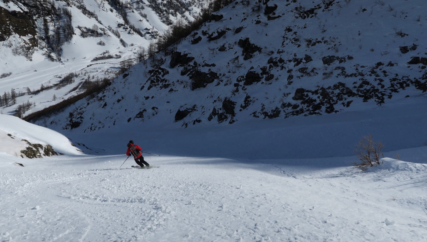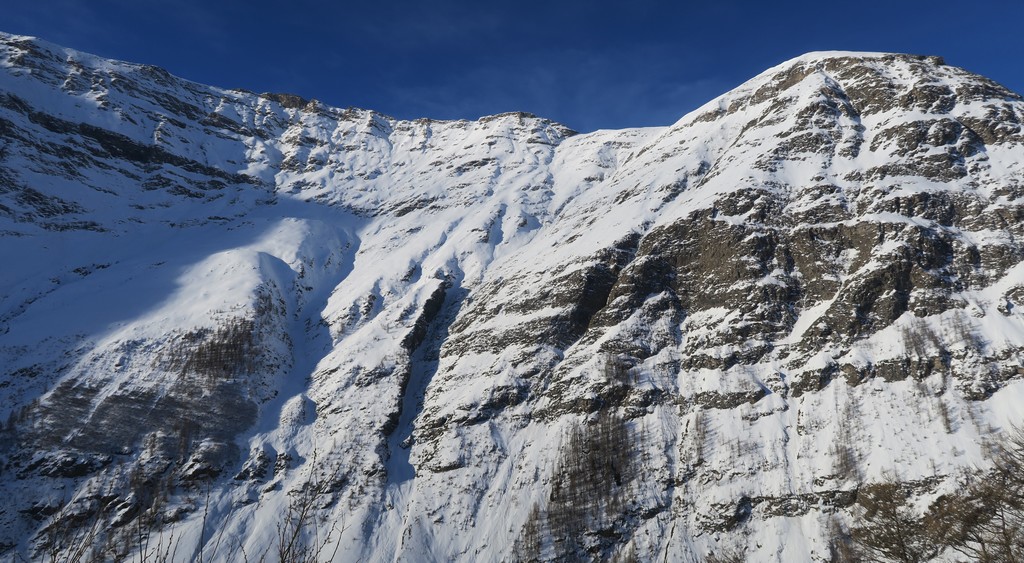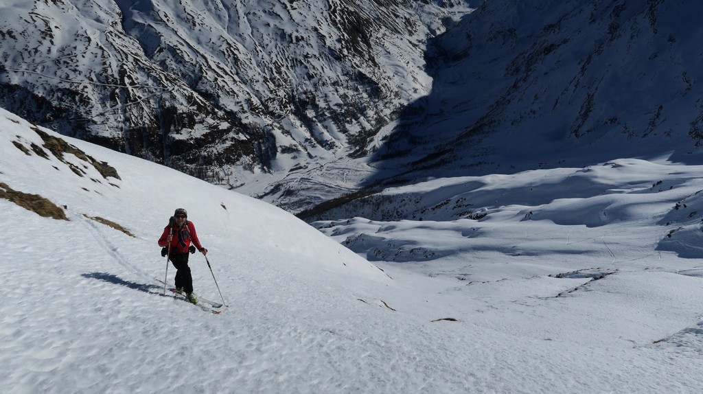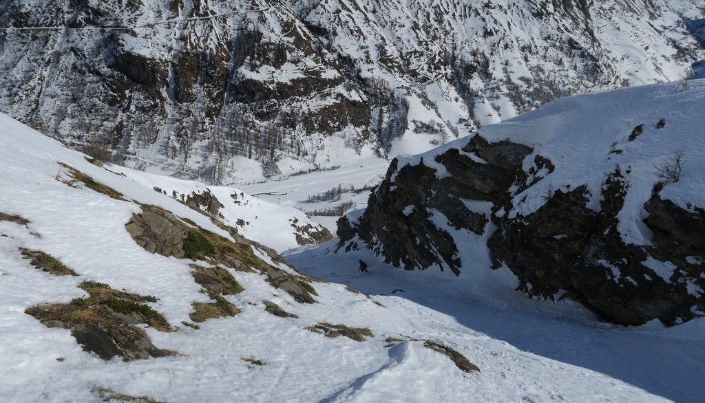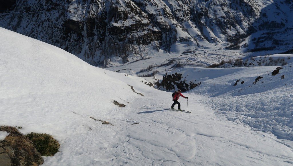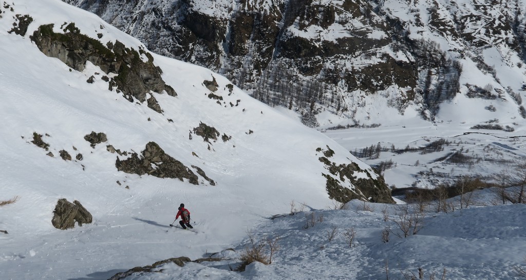 Cette face à une bonne composante nord où le soleil ne tape pas trop encore du coup la neige y est restée froide. En plein est c'est transfo et ça se pourri vite mais rien d’inquiétant à l'heure de notre descente. Les grandes pentes plein est directement sous le sommet avaient elles purgé ces derniers jours mais ce n'est pas elles qu'on emprunte.